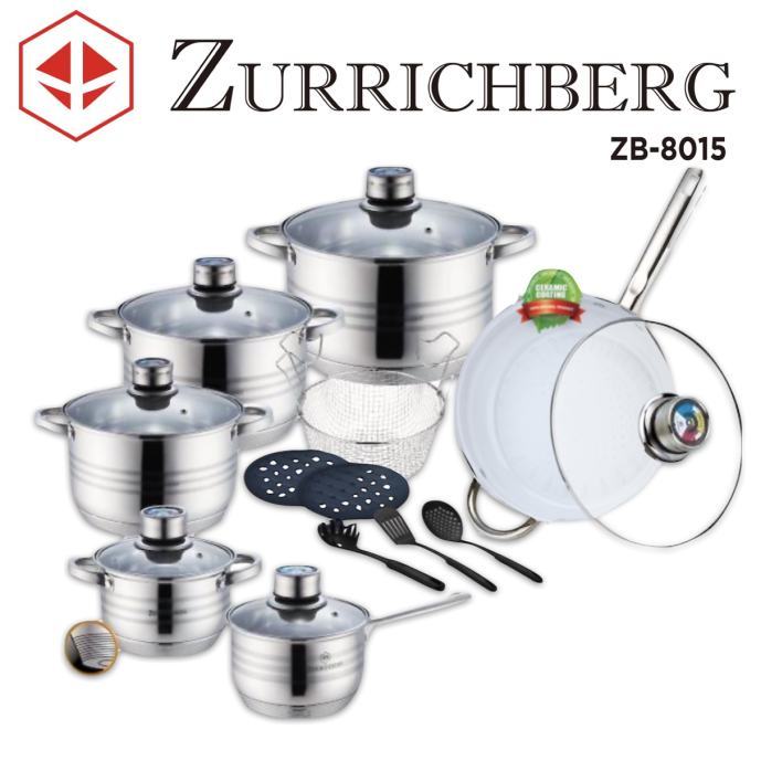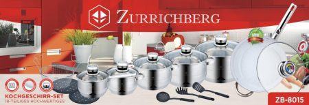 Vrhunski 18-dijelni set posuđa Švicarske marke ZURRICHBERG® izrađen je od kvalitetnog nehrđajućeg čelika inox 18/10 i debelim dnom od 9 slojeva, te je pogodno za indukciju.