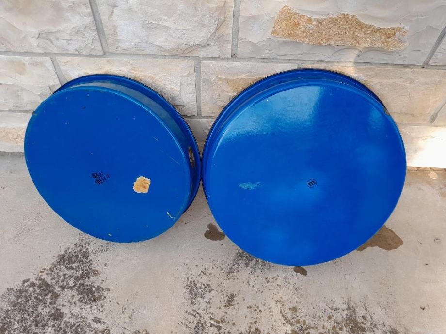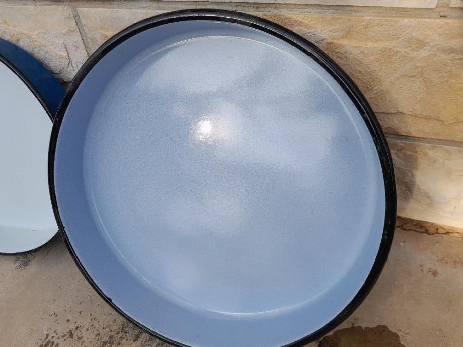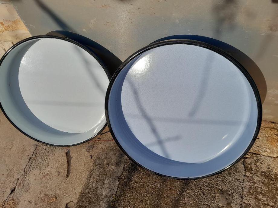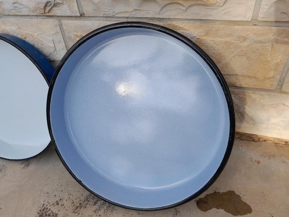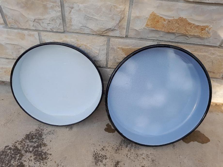 2 TEPSIJE ZA PEKU. VELIKA TEPSIJA 35,5cm PROMJER UNUTRA, NEMA UNUTRA OGREBOTINE NI RĐE. MALA TEPSIJA PROMJER UNUTRA 32cm, IMA PAR OGREBOTINA I TU JE VIDLJIVA RĐA NA PAR MJESTA UNUTRA.