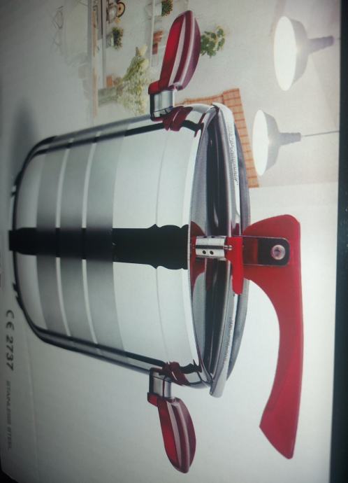 Izvana ispolirano, zrcalni odsjaj, bakalit drške u boji, otporno na sve udarce, prikladno za pranje u perilici posuđa, pogodno za sve vrste ploča za kuhanje, uključujući indukciju. Novo, nekorišteno.