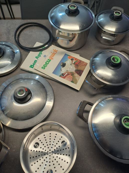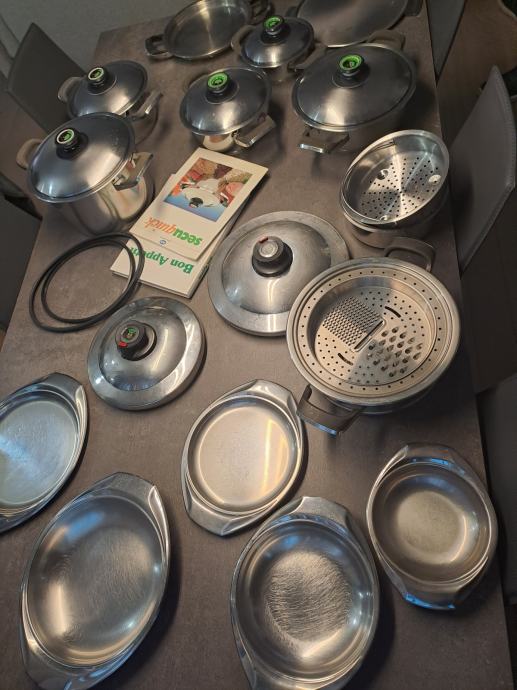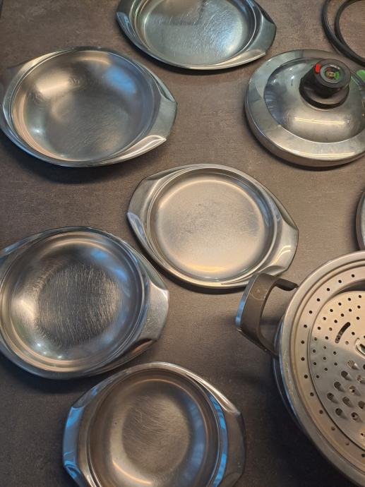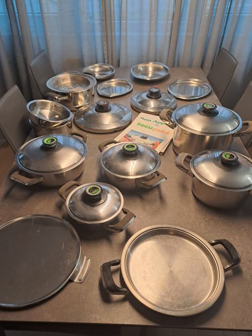 Prodajem veliki set AMC posuđa. Sadrži 2 secuquick poklopca (plus rezervne nove brtve), 5 lonaca s poklopcima, tava, cjedilo s dodacima, 5 posuda za posluživanje i 1 veći poslužavnik.