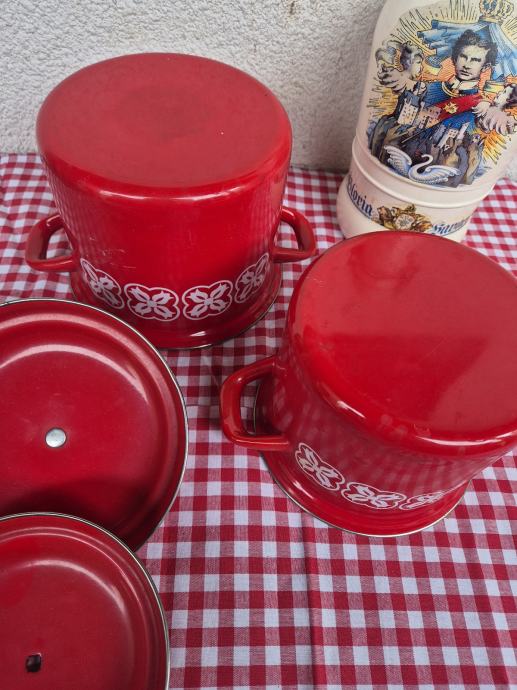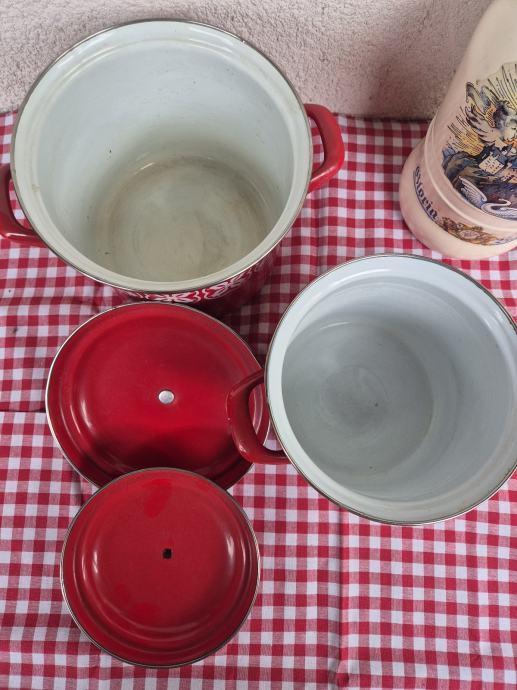 Na prodaju 2 vintage lonca s poklopcima, bez oštećenja, s manjim tragovima korištenja. Kod manjeg lonca - na poklopcu, nedostaje ručkica na poklopcu. Cijena je za oba.