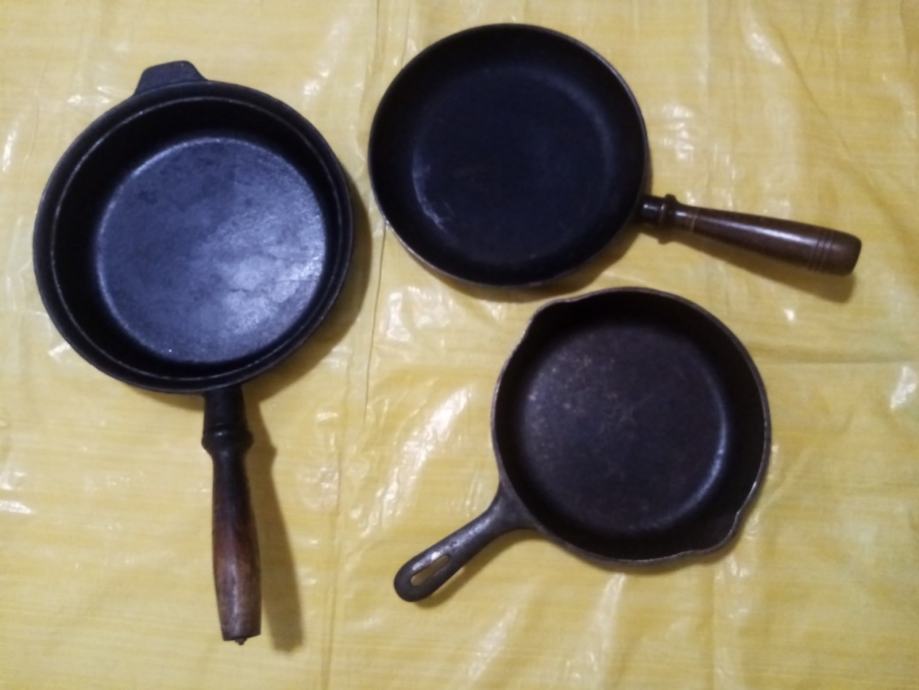 - Glatka tava fi 25, ukupna duljina 42 cm, od ljevanog željeza sa drvenom demontažnom ručkom, 15 eura