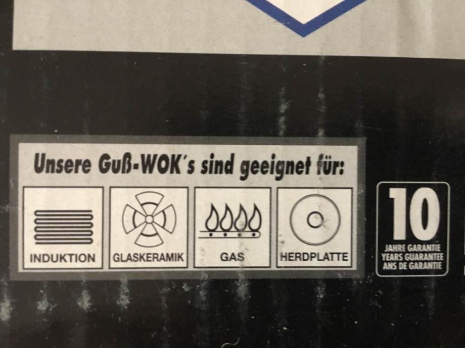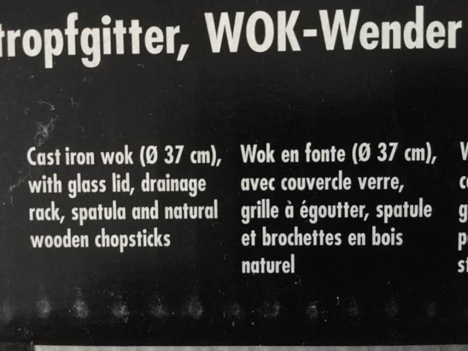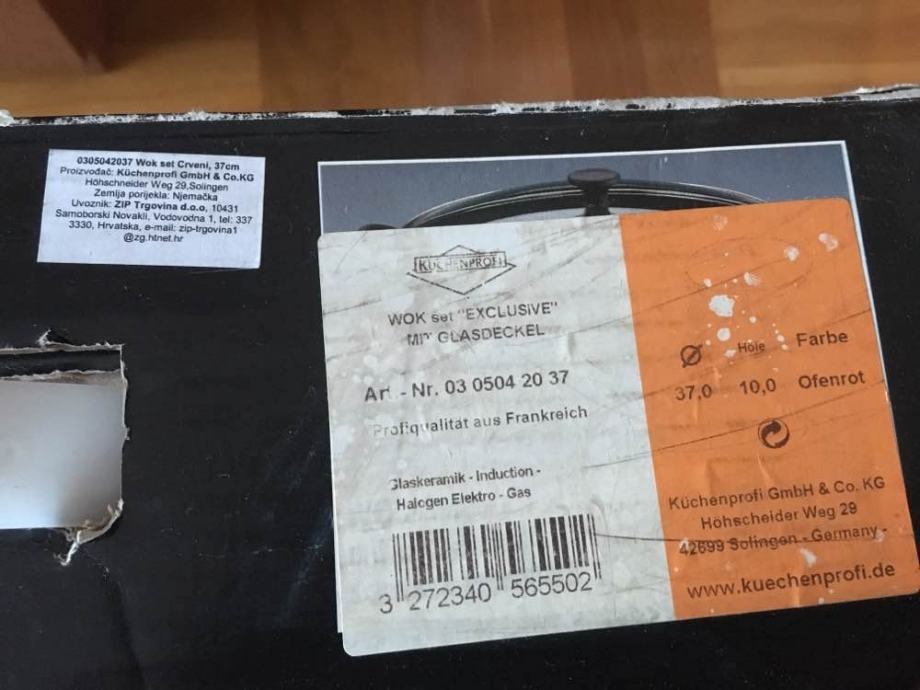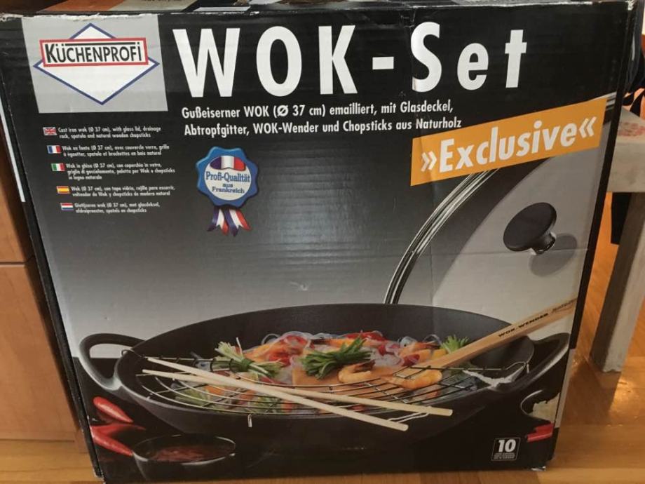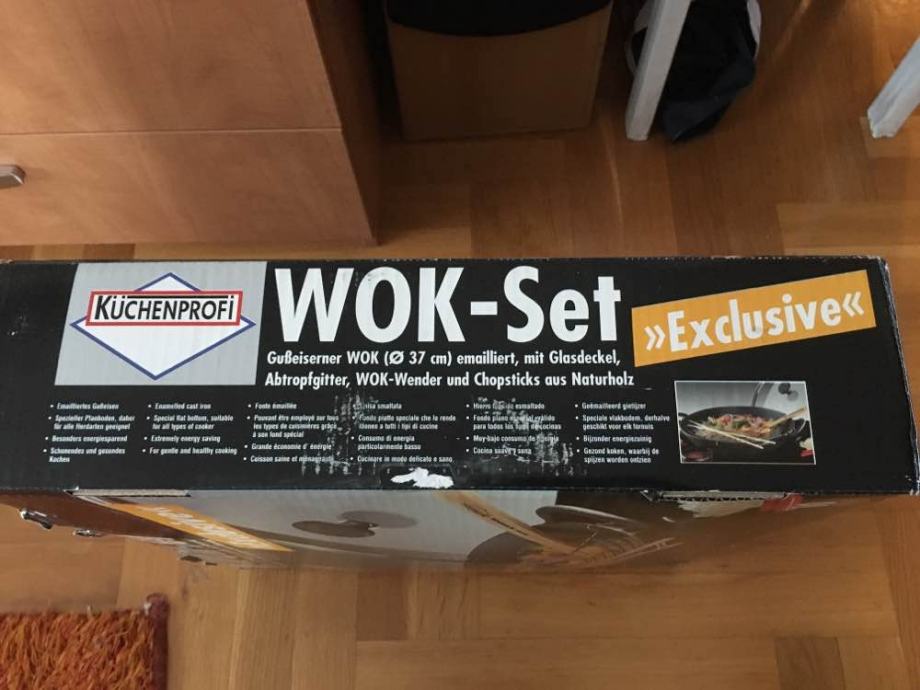 Wok tava od gusa, stakleni poklopac, rešetka za ocijeđivanje, drvena kuhača, drveni štapići (par). Masa tave cca 5,5 kg.