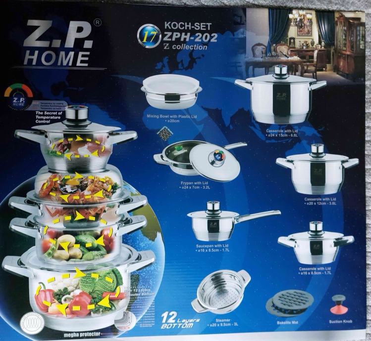 Z.P.INTERNATIONAL posuđe izrađeno u potpunosti od čelika, dno s 12 slojeva za potpuno kuhanje, neklizajuće ručke i poklopci sa sustavom „THERMO CONTROL“ za veću preciznost u kuhinji. Vrlo sličan kvalitetnijim brandovima proizvođača posuđa. Može biti alternativa za vikendice ili apartmane gdje vam treba nešto što će izgledati dobro, a neće biti preskupo!