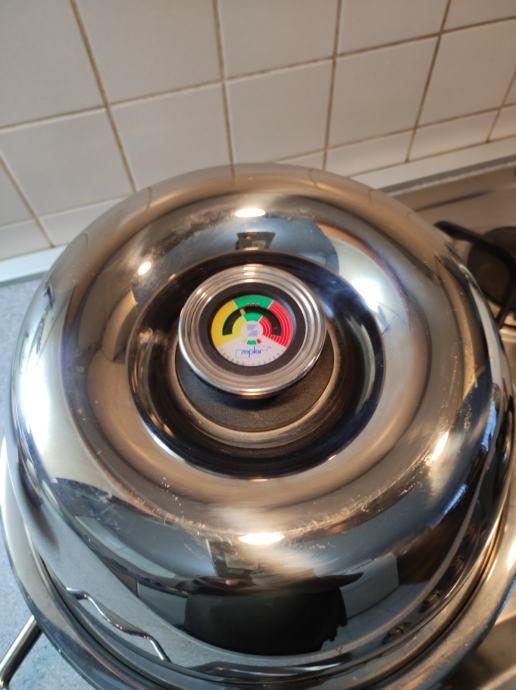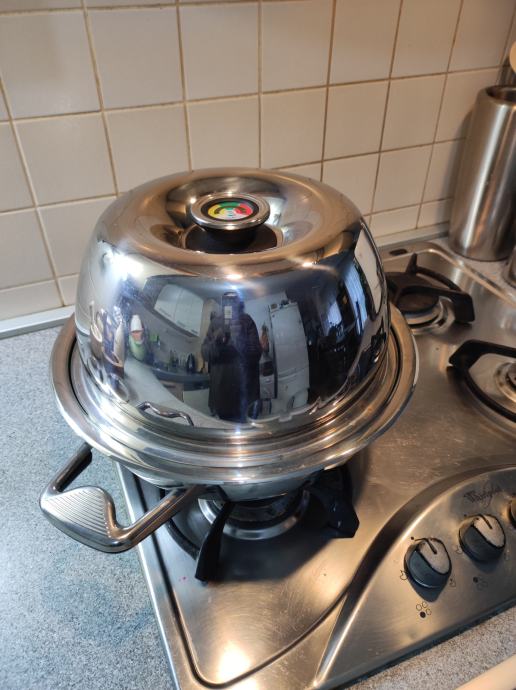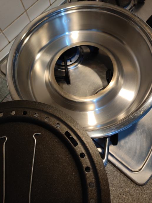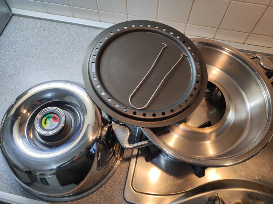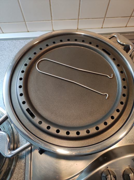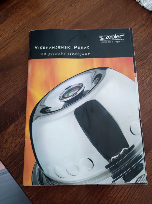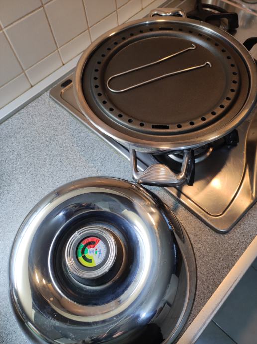 Zepter TF-990 multifunkcijski pekač za plinske štednjake, mogućnost kuhanja na paru, pečenja mesa i ribe bez masnoće, pizza, kruh, neprijanjajuća podloga, termostat na poklopcu. Poklopac služi i kao zdjela. Vrlo malo korišten, u odličnom stanju, kao nov, bez oštećenja i ogrebotina. Uz njega ide knjižica recepata i upute za korištenje.