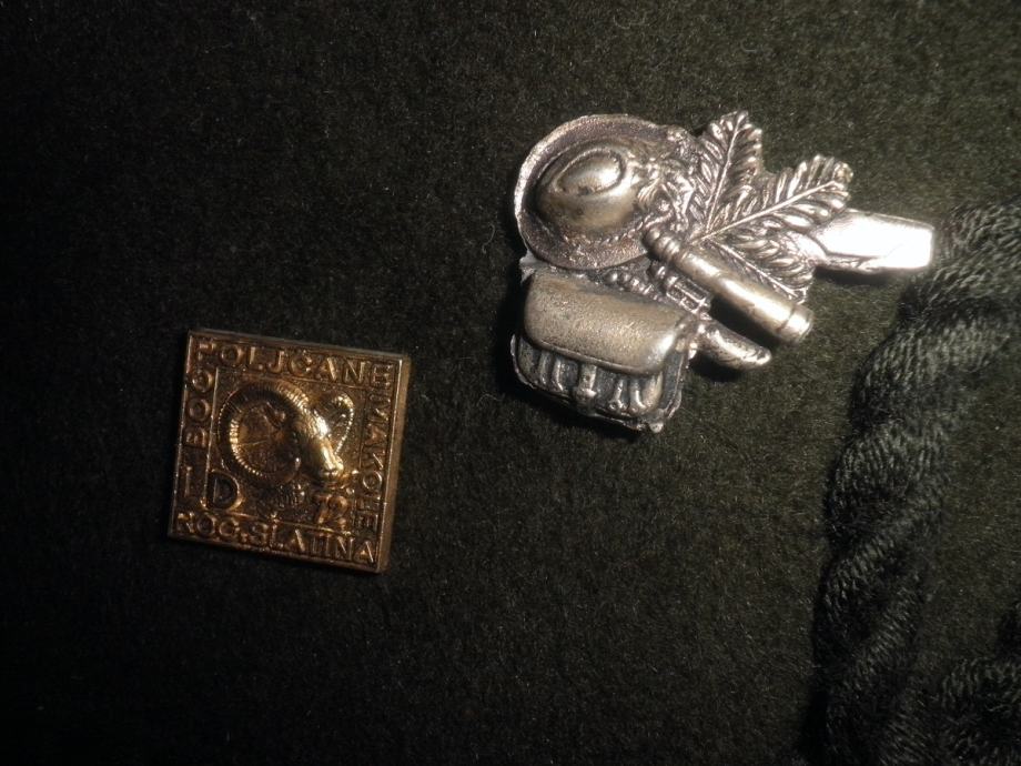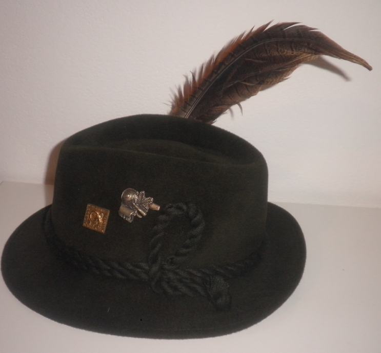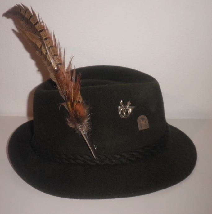 Lovački šešir Piccadilly sa značkama i ukrasnim perom, vel. 57.