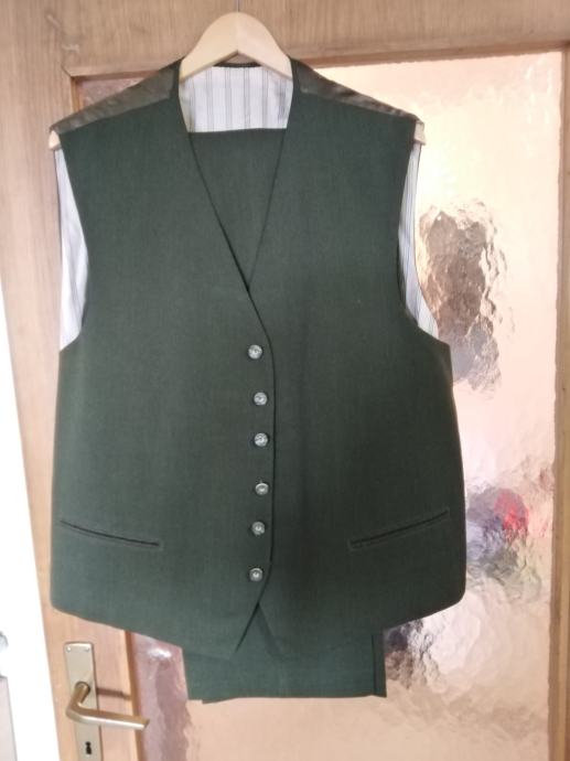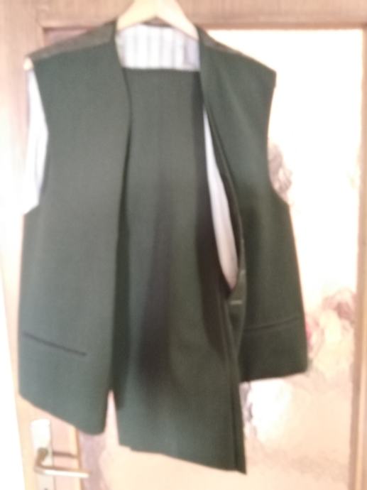 Prodajem rabljeno lovačko odijelo u tamno zelenoj boji. Komplet se sastoji od sakoa i prsluka. Sako je klasičnog kroja s ukrasnim metalnim gumbima i stojećim ovratnikom, a prsluk također dolazi s metalnim gumbima i bočnim džepovima. Na leđima prsluka nalazi se dio od drugačijeg materijala u sivo-smeđem tonu.