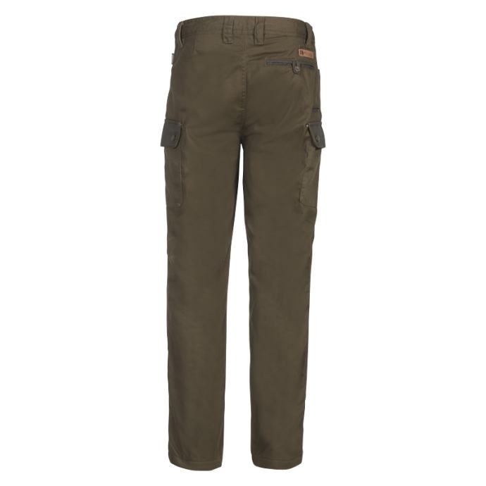 65% poliester, 35% pamuk, vodoodbojna završna obrada, podstava od 100% poliesterskog mikroflisa. 6 džepova uključujući 1 džep za nož, neklizajući elastični pojas koji se podiže straga, oblikovana koljena.
