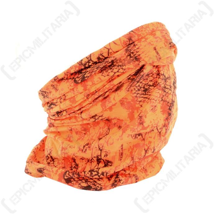 Višenamjenski šal u Snake Blaze narančastoj boji. Unatoč svom svijetlom izgledu, jeleni zapravo ne mogu vidjeti narančasto/sjajeću kamuflažu kao ljudi, što ga čini savršenim za skrivanje od vašeg plijena, a da pritom ostane vrlo vidljiv drugim lovcima.