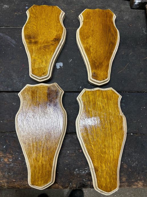 Podloge su izrađene od drveta hrasta, trešnje ili smreke. Cijena može varirati ovisno o izboru drveta. Premaz drveta je po želji kupca – birajte između različitih vrsta zaštite i boja kako biste savršeno upotpunili svoj trofej.