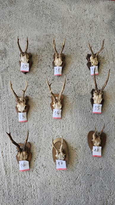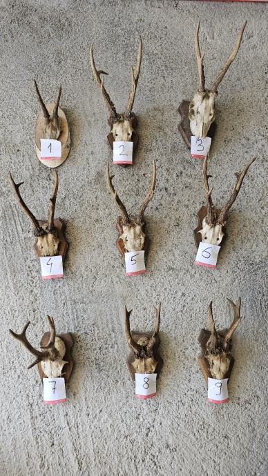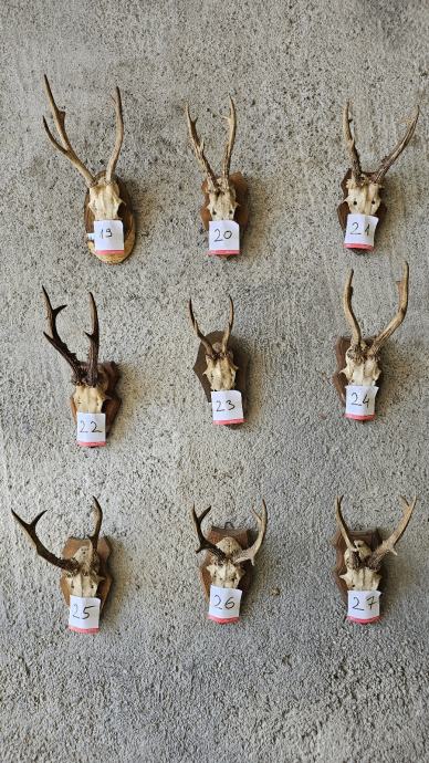 Prodajem više rogova srndaća na daskama, pripremljenih za vješanje na zid.