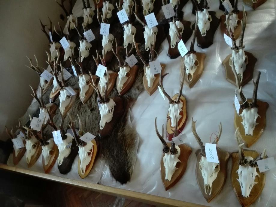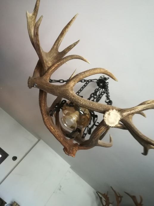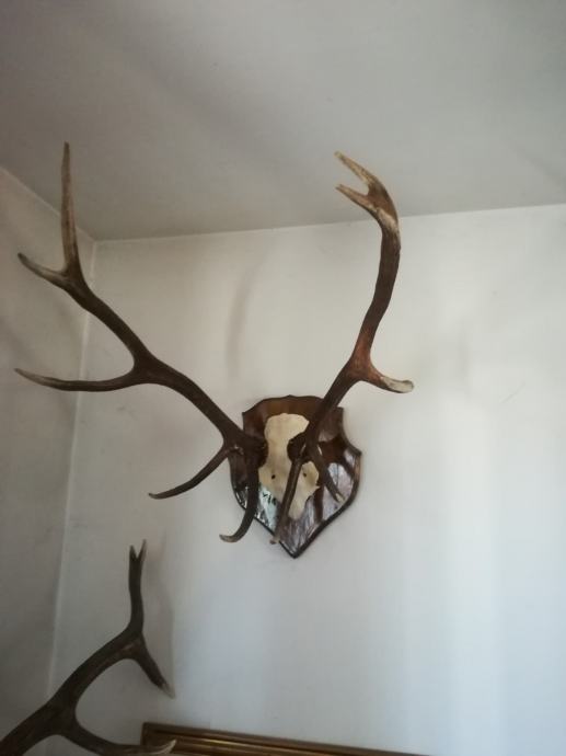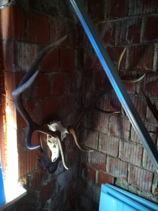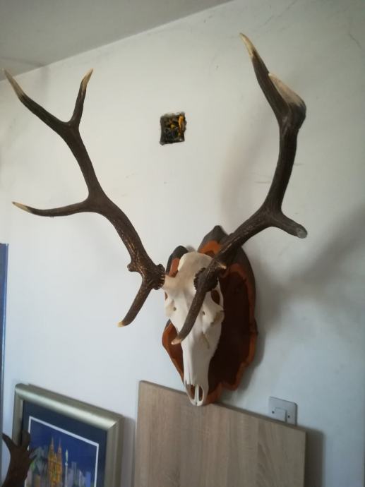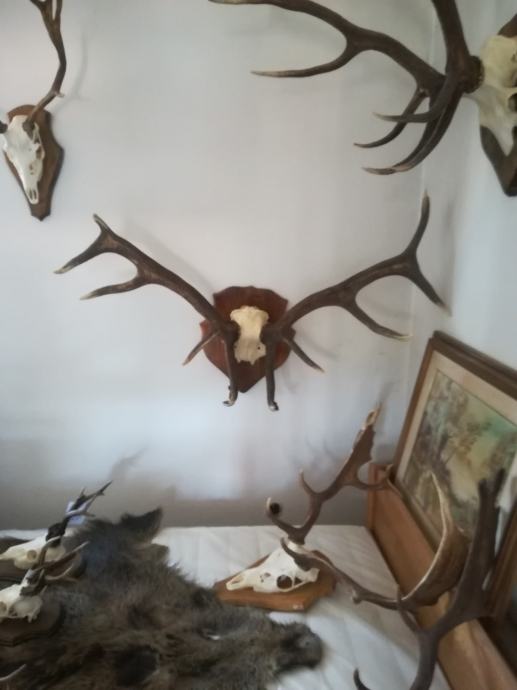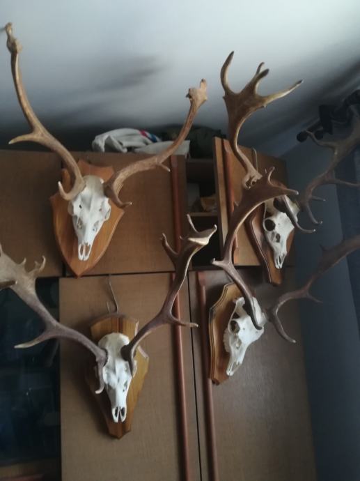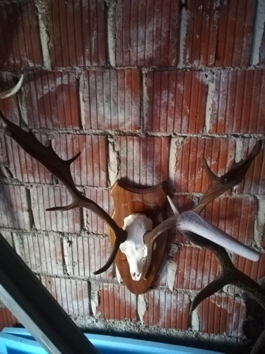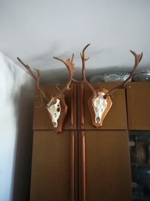 Lovački trofeji rogovi srnjaka na drvenim polakiranim pločicama. Cijena jednog je između 26 i 40€ , tj na svakom je okačena cijena od prije u kunama. Nisu dugo stajali pa nema prašine i lubanje su bijele. Jelenji rogovi na ormaru su 100eura po komadu. Najveći jelenji rogovi su na zidu, cijena im je 300eura po komadu. Rogovi muflona su 200e i lustser je 250eura. Cijena je fiksna. Na SMS nemogu odgovoriti, najbolje bi bilo da me nazovete 099 687 5657 ili pošaljete poruku preko Njuškala.