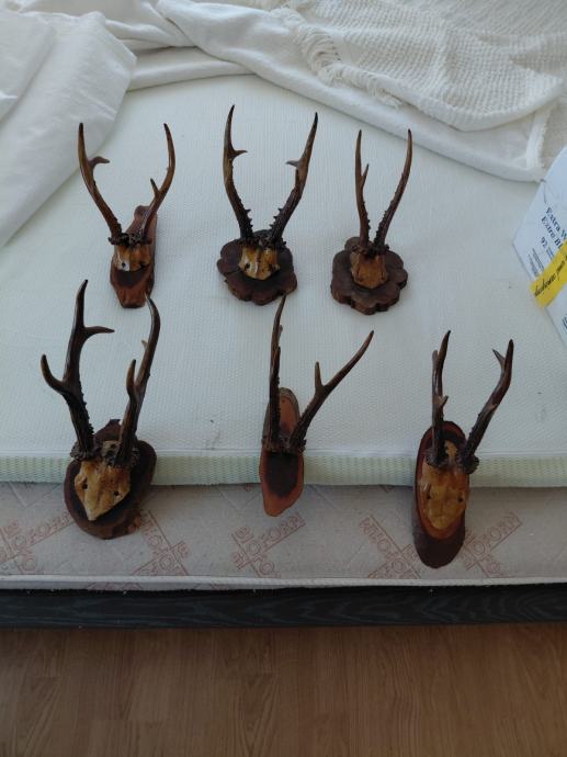 Prodajem šest trofeja srndaca, svaki montiran na drvenu podlogu. Rogovlje je različitih veličina i oblika, a podloge su u tamnoj, rustikalnoj izvedbi koja je uobičajena za ovakvu vrstu izlaganja. Svi trofeji su pripremljeni za vješanje na zid.