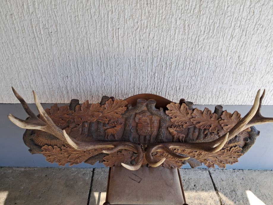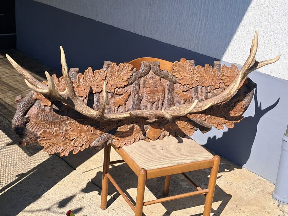 Prodajem vješalicu od odbačenih jelenskih rogova na ručno izrezbarenoj podlozi u odličnom stanju. Rogovi su od jelena dvanaesterca i pravilnog su oblika. Na podlozi su izrezbareni šumski motivi i pravo je umjetničko djelo. Podloga je široka 130 cm, a visoka 40 cm.