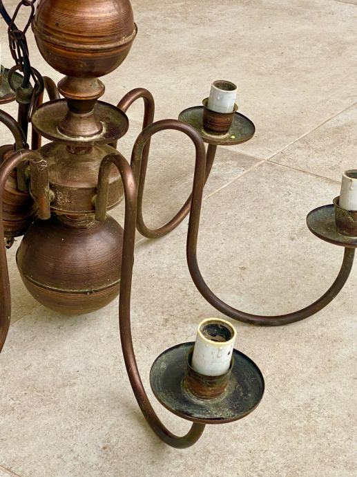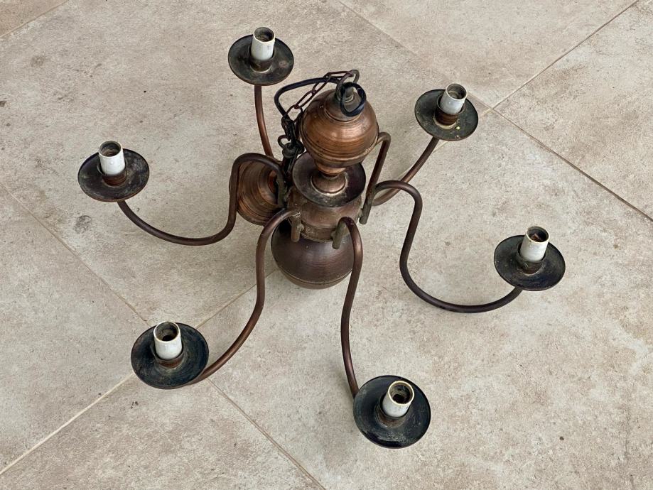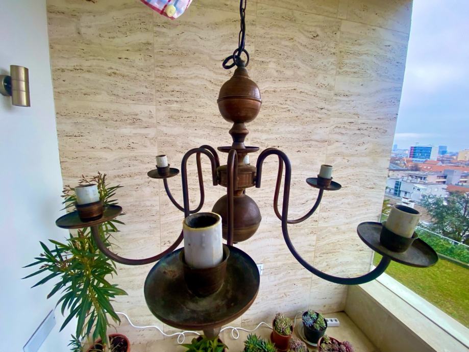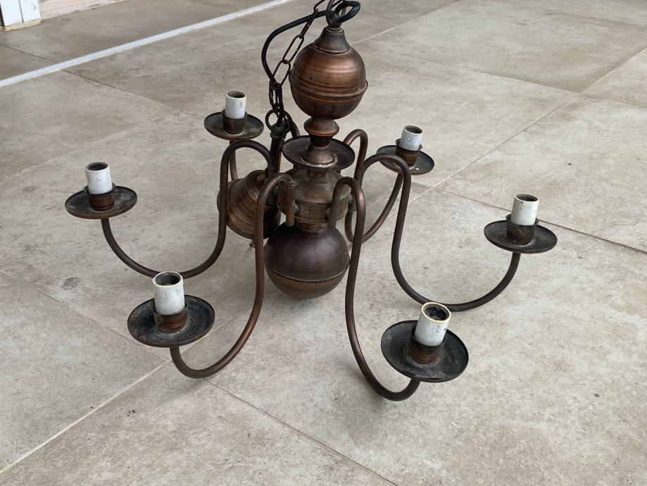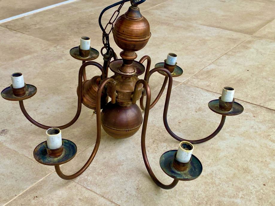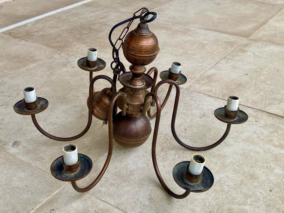 Prodajem bakreni luster iz 70-ih godina, tzv. Holandez. Visina lustera bez lanca je 40 cm, s lancom 73 cm, promjer 60 cm. Luster ima 6 rasvjetnih tijela.