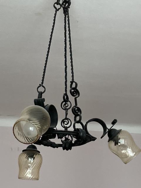 Starinski, rustikalni kovani luster, crni s tri svjetleća mjesta.