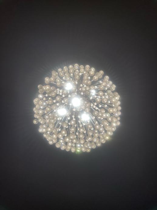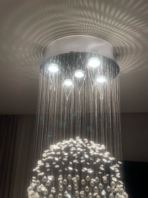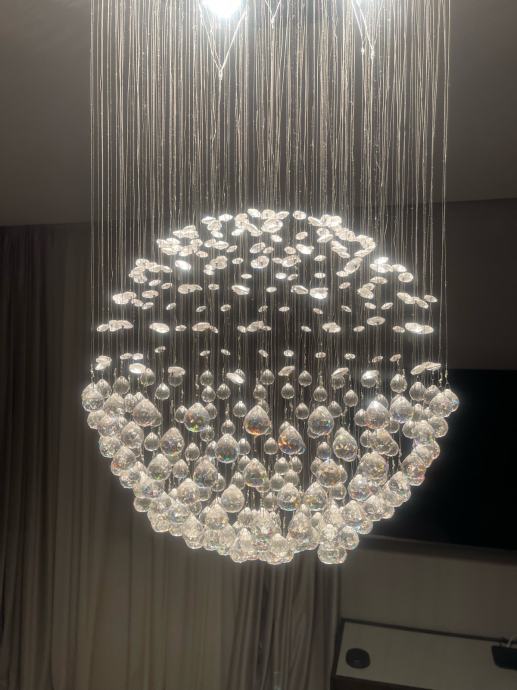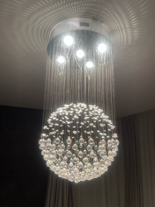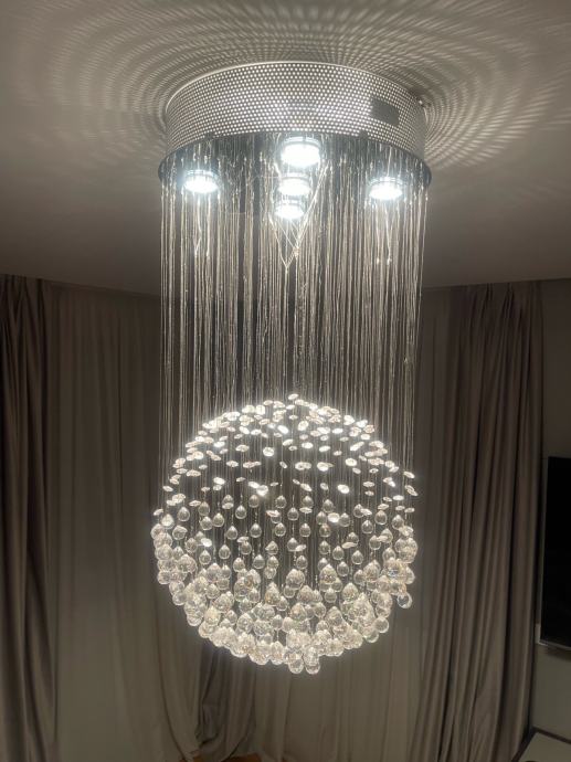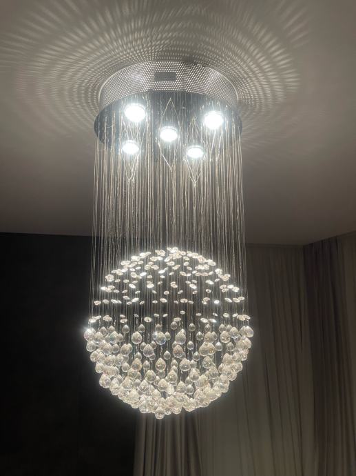 Pravi kristali na tankim sajlama, promjer kugle 45 cm, dužina lustera 85 cm, obruč sa led lampama od inoksa.