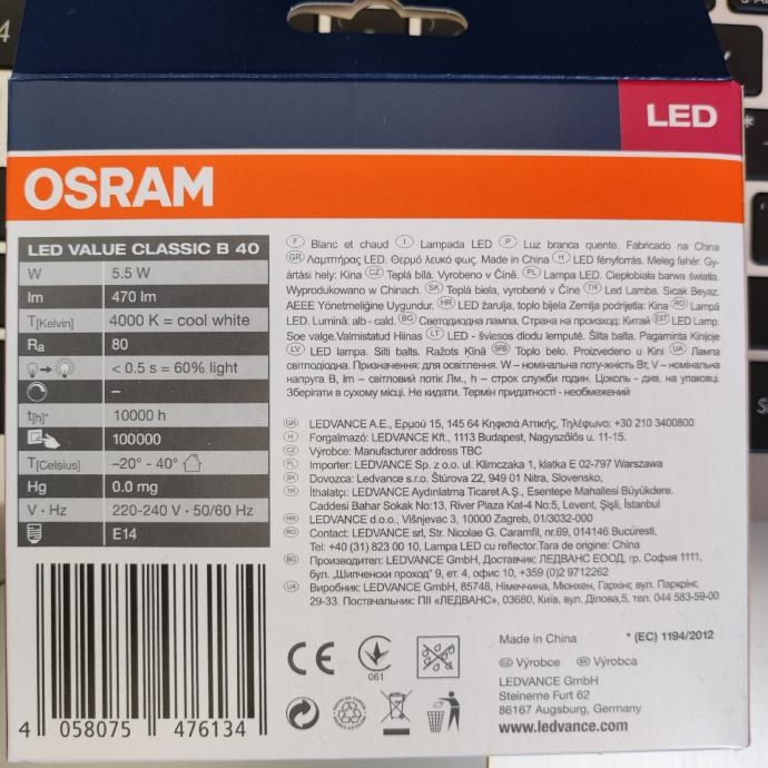 osram e14, 5,5W, 470lm, 4000K.