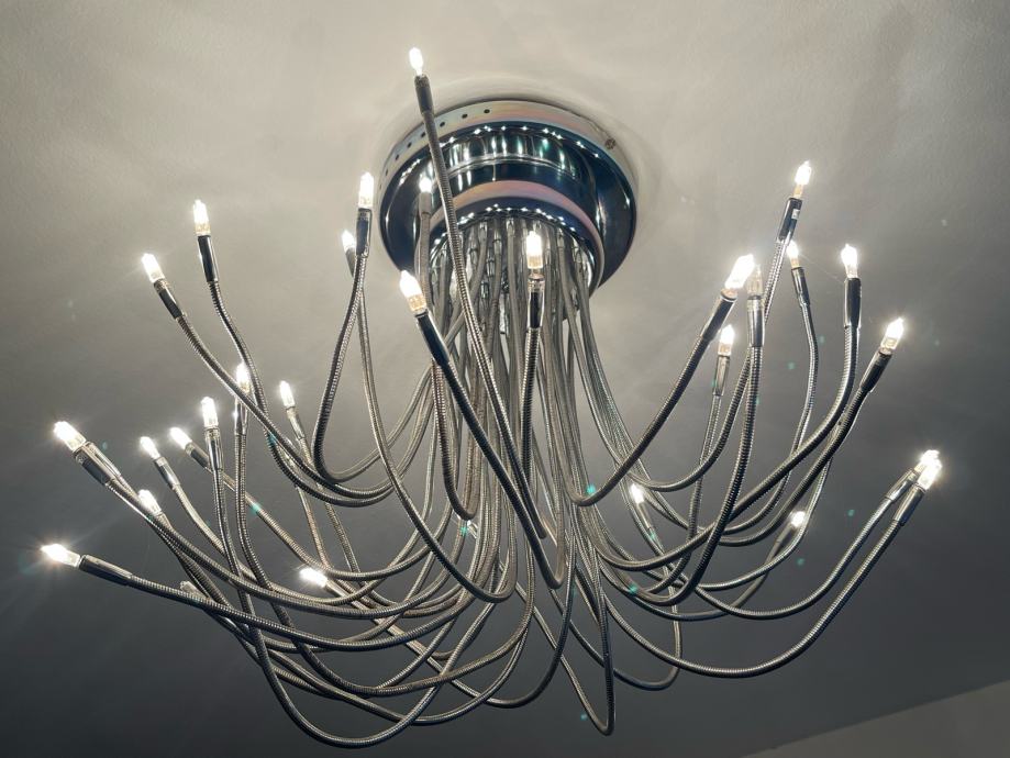 Prodajem 4 lustera, visilice. Svaki luster ima 32x10w halogene žarulje G4 s pripadajuća 4 transformatora u kućištu.