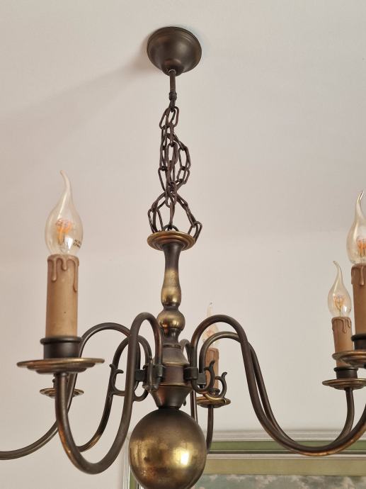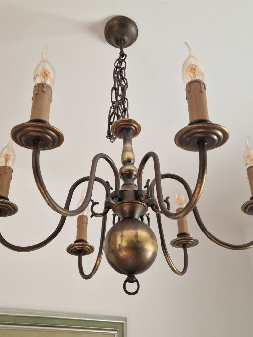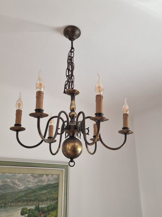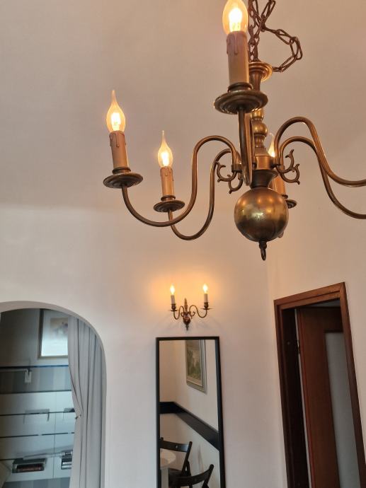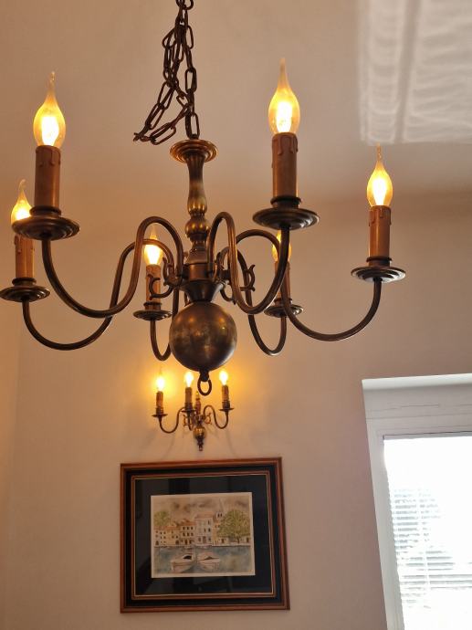 Prodajem očuvan i ispravan "holandez" luster sa 6 krakova, te 3 komada zidnih svjetiljki. Dvije zidne svjetiljke su sa 2 kraka, i jedna zidna svjetiljka je s 3 kraka. Uz luster i zidne svjetiljke idu i retro žarulje sa žarnom niti (led žarulja sa žarnom niti, efekt plamena svijeće).