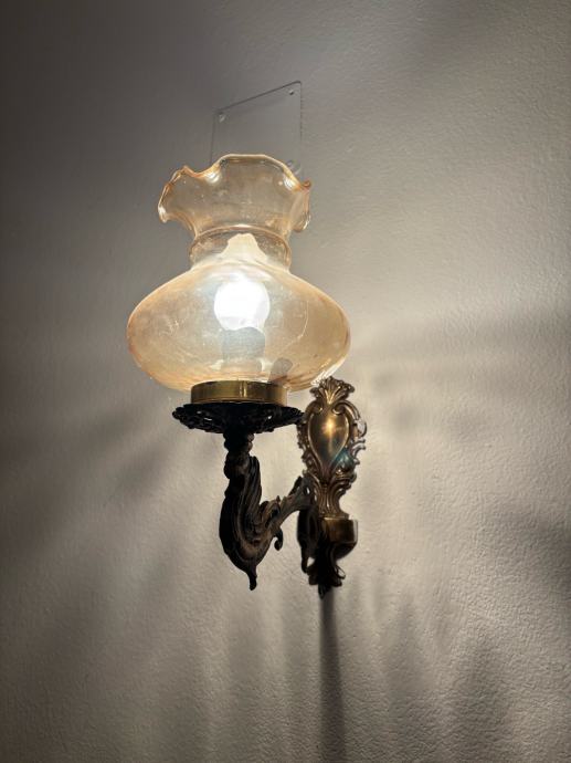 Prodajem prekrasan luster sa dvije zidne lampe u kombinaciji keramike, metala i stakla. Luster ima tri kraka sa staklenim sjenilima u bež-jantarnoj boji koja daju ugodnu i toplu svjetlost. Središnji dio je keramički u smeđe-crvenim tonovima, a metalni elementi su u tamnoj, patiniranoj završnoj obradi. Sjenila su elegatno oblikovana s valovitim rubovima.