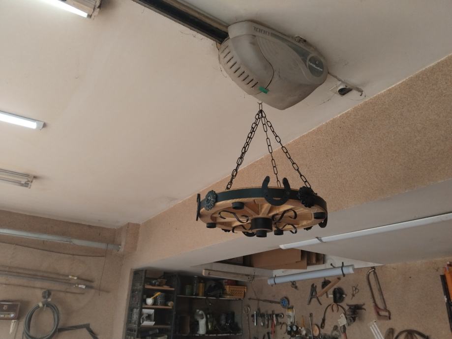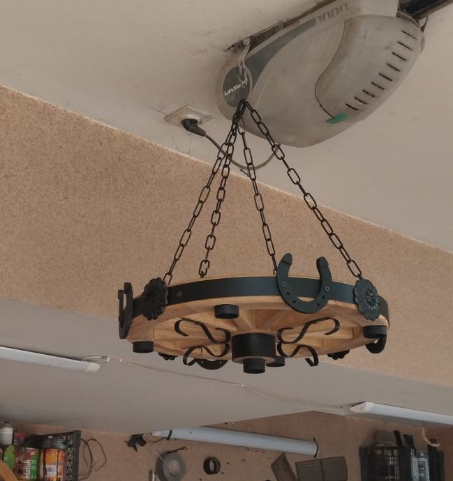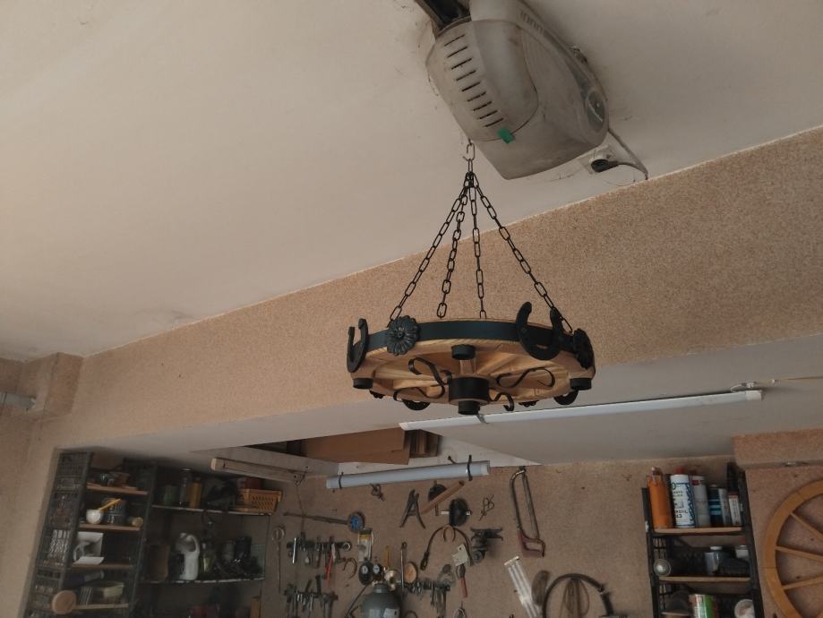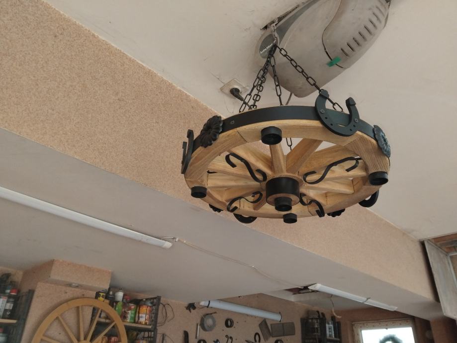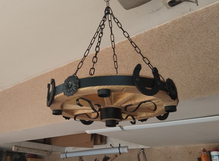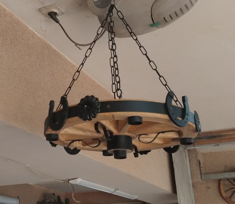 Luster od novog drvenog kotača sa kovanim elementima , Struja je spojena , promjer 45 cm. Redovna Cijena 140 Eura, sada je 90 Eura po akcijskoj cijeni