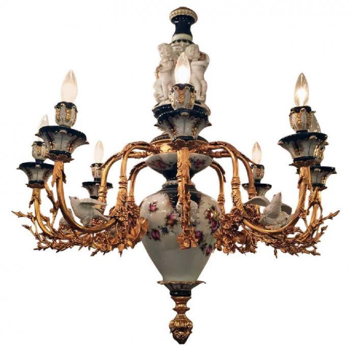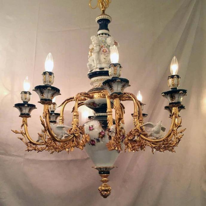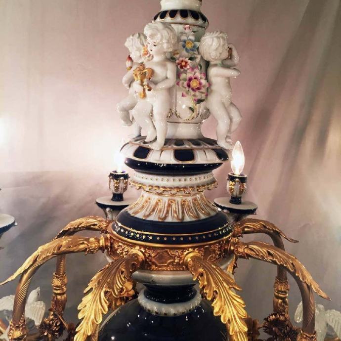 Unique Cobalt Blue, White, Gold Leaf Porcelain Chandelier with Cherubs