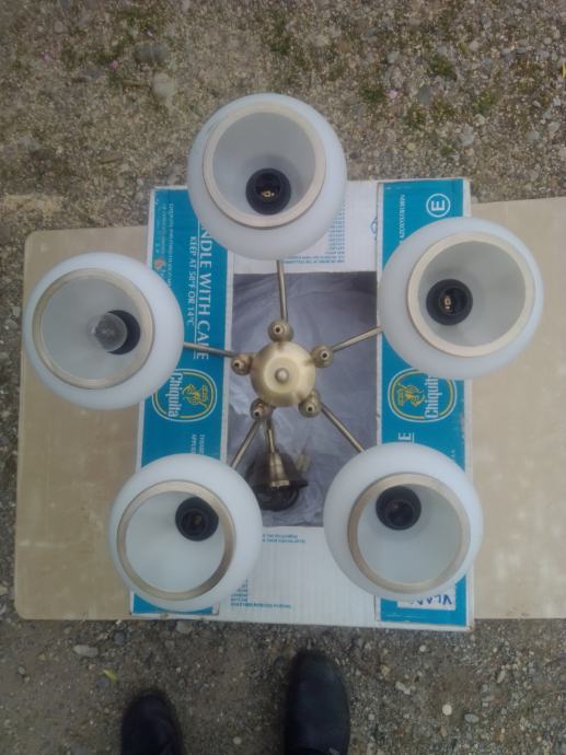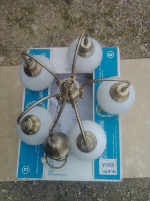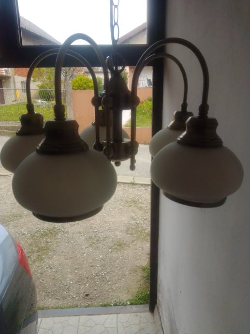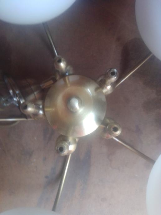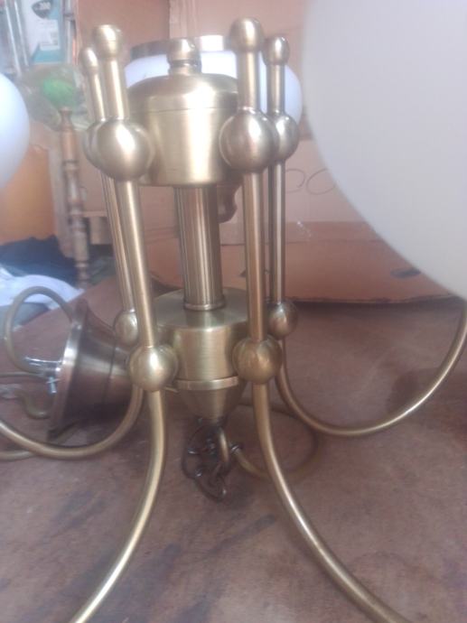 Širina lustera 45 cm,V bez lanca 30 cm,sa lancem 55 cm.Kugle Š 14 cm, V 15 cm
