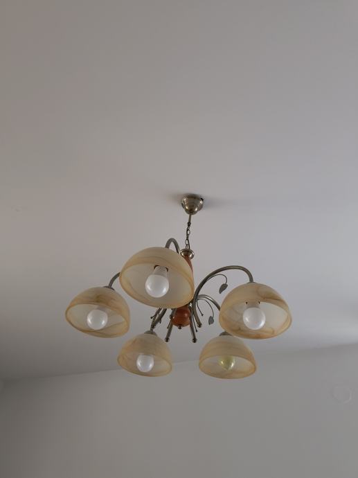 luster vrlo uščuvan, kombinaciji drva u boji trešnje, mesinga i pet staklenih polukugli
