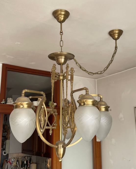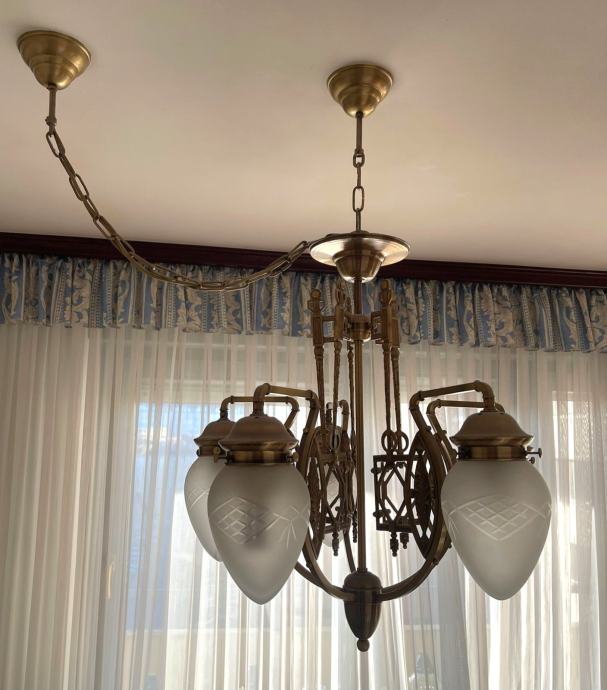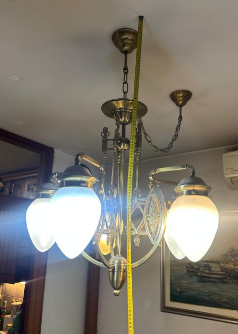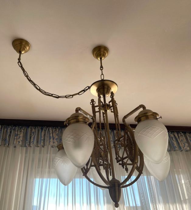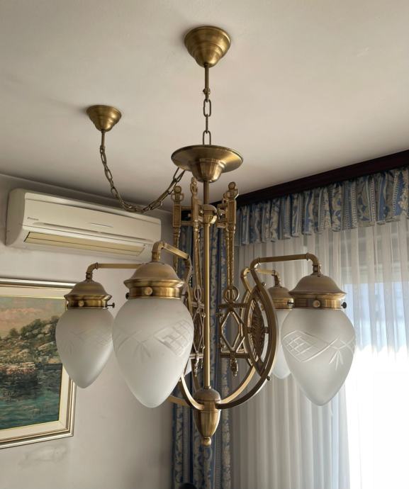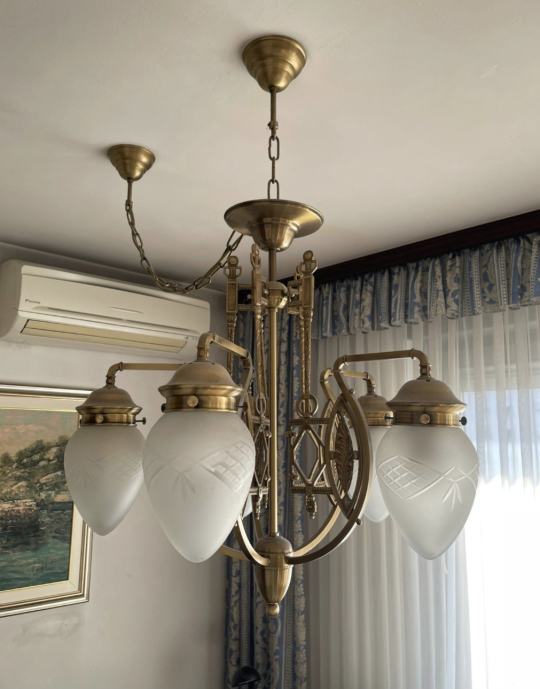 Predivan Orion Budapest luster, veliki, promjer cca 60 cm, visina cca 70 cm, na našem primjeru visina od stropa cca 92 cm. Orion je inače austrijska tvrtka sa sjedištem u Beču, proizvode visokokvalitetnu rasvjetu od 1948 g. Sve rezervne dijelove kod njih možete naručiti i nakon puno godina. Luster ima 5 matiranih kristalnih kapa sa žaruljama E27, max 60 w svaka. U odličnom stanju, kao novi, prvi vlasnici, kupljen direkt u Orionu i odtada je na stropu.