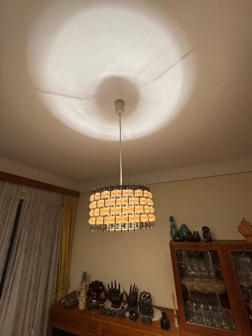 Toplo difuzno svjetlo kroz višeslojno pletivo, tamni obruči naglašavaju ritam i daju skulpturalan izgled. Super ide u boho/MCM/skandi interijere.