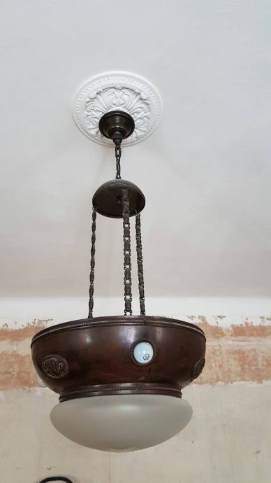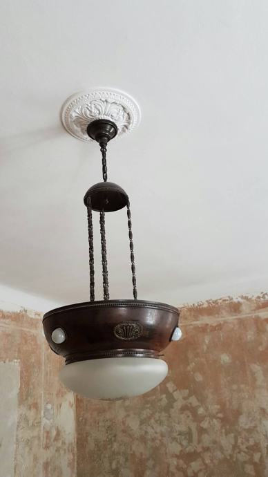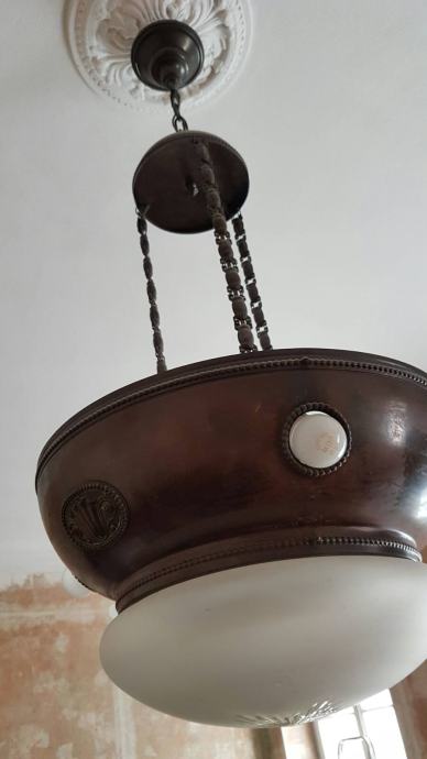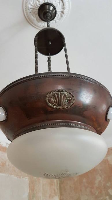 Veliki mjedeni secesijski luster... očuvan. Promjer mjedenog dijela: 49 cm. Visina mjedenog dijela: 30 cm. Visina nosivih žica: 90 cm Ukupna visina lustera: 120 cm. Stanje kao na fotografijama.