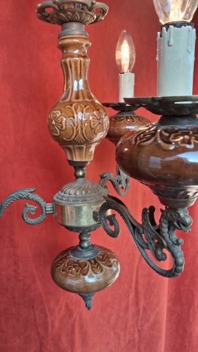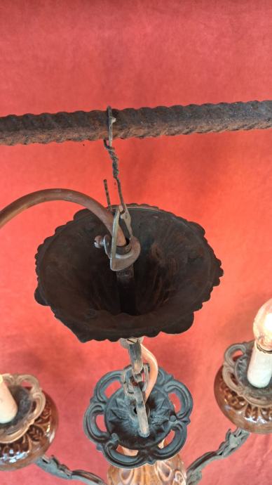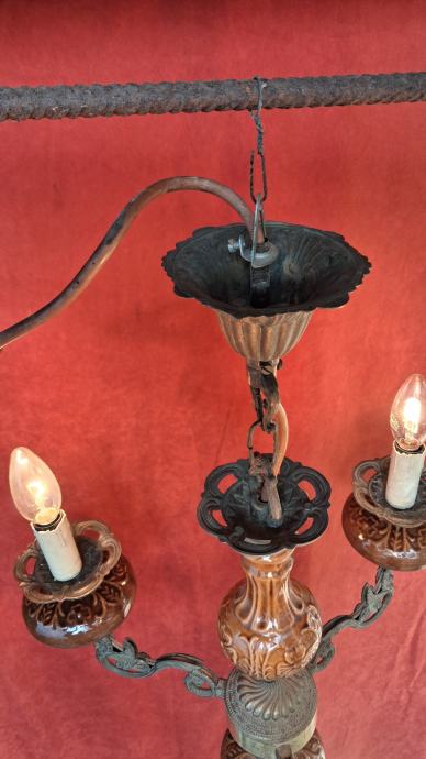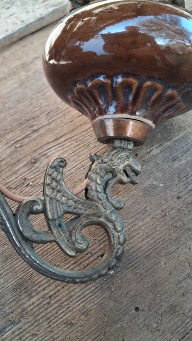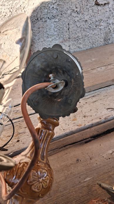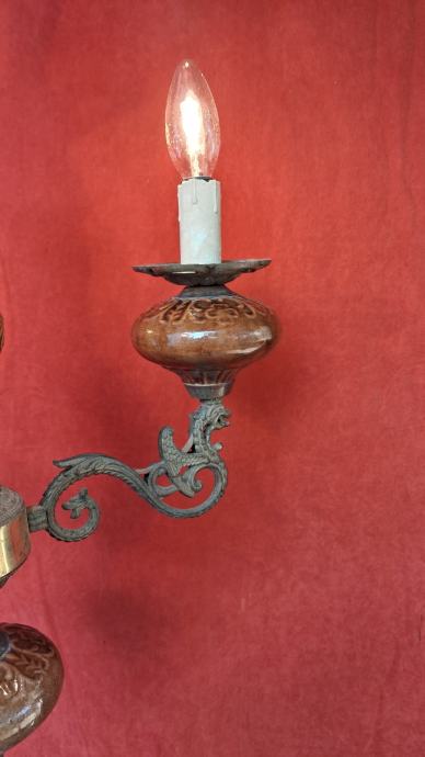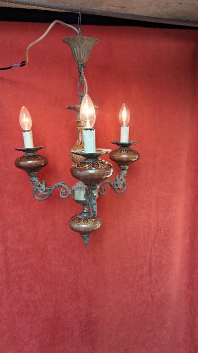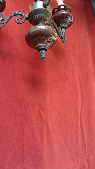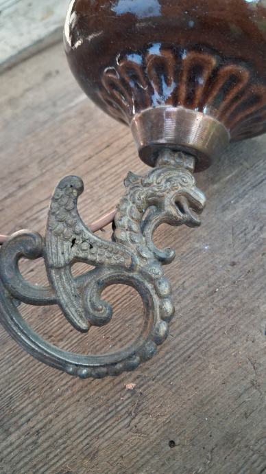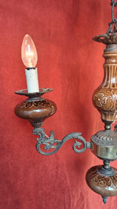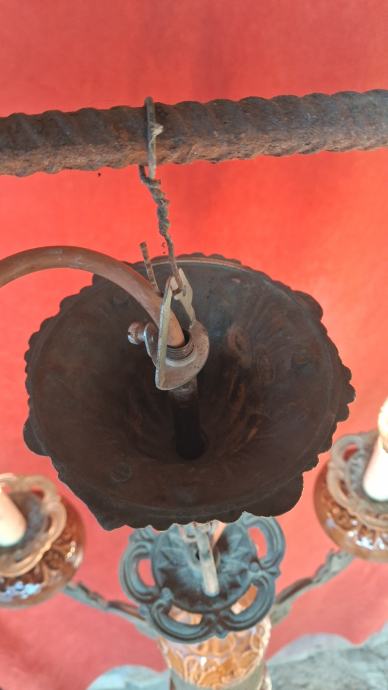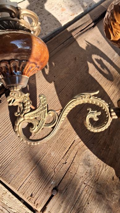 Prodaje se luster sa ukrasnim figurama u obliku zmajeva od mesinga i tri rasvjetna tijela (žarulje). Luster je visok cca 60 cm dok je razmak između rasvjetnih tijela između cca 20 cm do cca 21 cm. Lusteru svijetle žarulje (vidljivo na fotografijama), ali mu se razbilo jedno od tri staklena sjenila tako da se prodaje bez staklenih sjenila kao oštećeno/neispravno. Žarulje se ne prodaju sa lusterom. Cijena lustera je 220 eura. Mogućnost osobnog preuzimanja u Zadru. Kontakt broj mobitela 091 131 10 36.