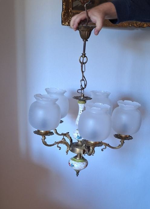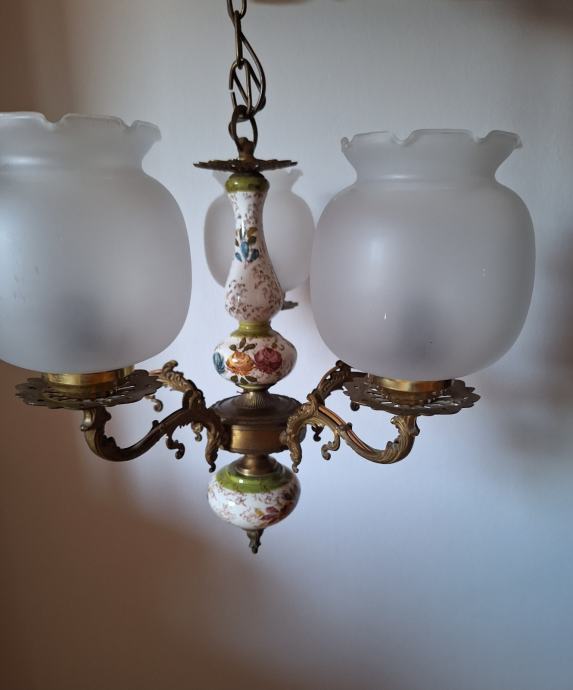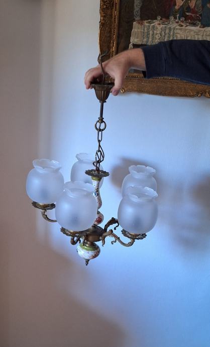 Prodajem viseći luster u odličnom stanju, bez oštećenja. Radi se o klasičnom modelu s pet krakova u zlatnoj boji, s porculanskim detaljima ukrašenim ručno slikanim cvjetnim motivima. Sjenila su izrađena od mat stakla u obliku kapljice s valovitim rubom, što lusteru daje elegantan, vintage izgled. Luster se vješa na metalnom lancu.