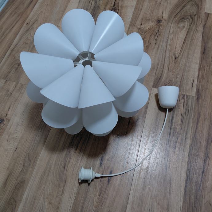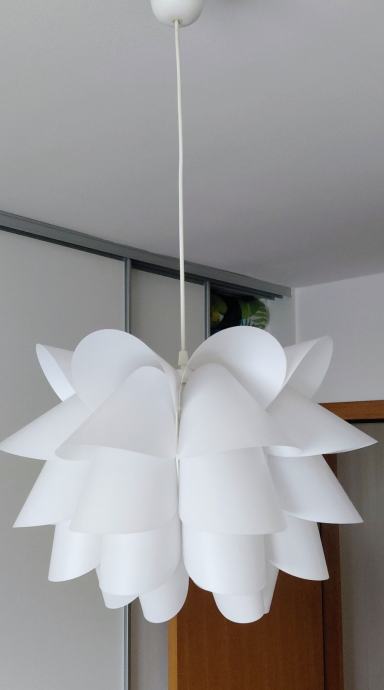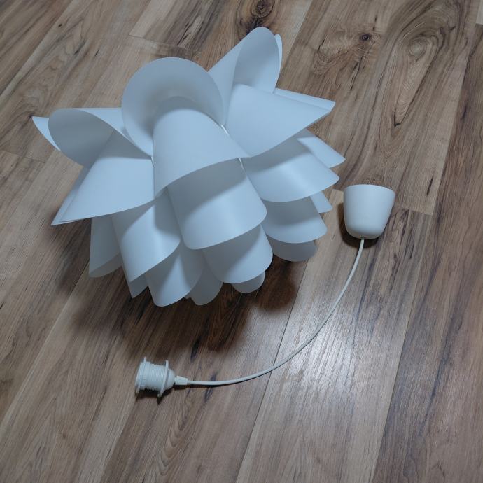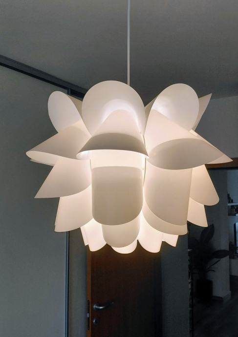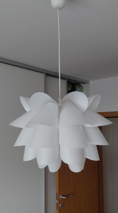 Prodajem visilicu bijele boje (kupljena u IKEA) zanimljivog dizajna s laticama koje podsjećaju na cvijet. Sjenilo je izrađeno od plastičnih ploča-polietilen posloženih u nekoliko slojeva, što pri upaljenom svjetlu daje lijep i mekan sjaj. Dolazi s bijelim kabelom za ovjes dužine 60 cm, duljina kabela se može lako prilagoditi te višak skupiti u stropnu kapicu i montirati uz strop. Visilica je očuvana i bez oštečenja te se lako održava. Zainteresirani molim se javiti SMS porukom. Hvala