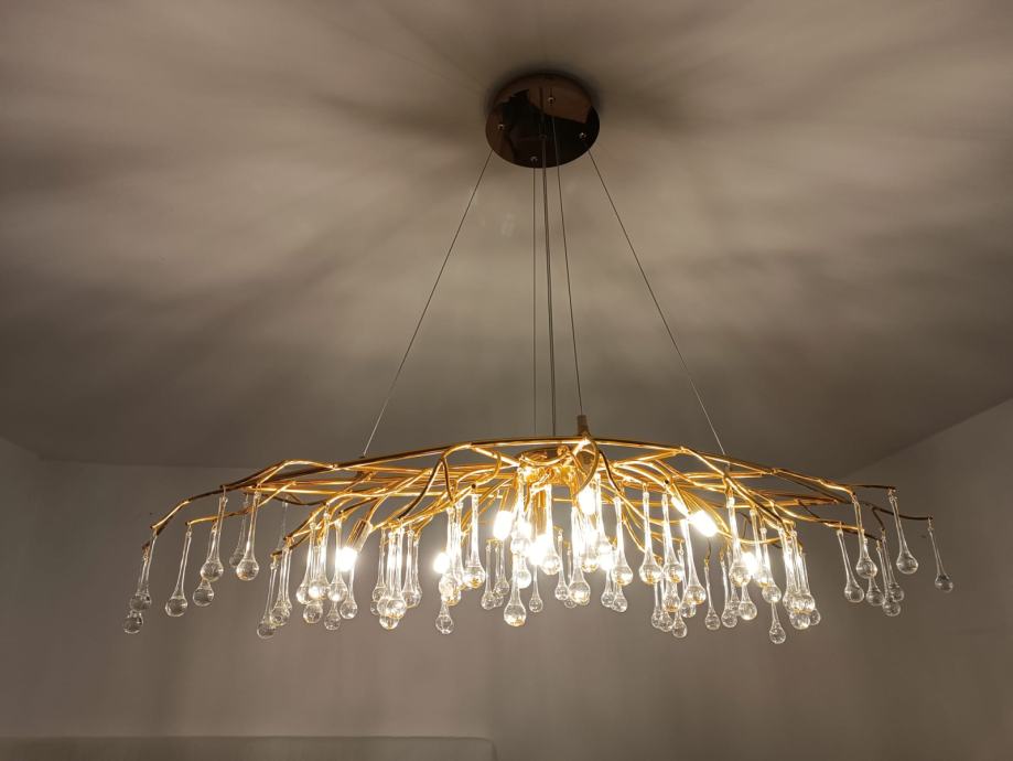 Prodajem moderan i vrlo efektan dizajnerski luster u odličnom stanju. Zlatna metalna konstrukcija u kombinaciji s visećim staklenim kapima daje luksuzan i elegantan izgled prostoru.