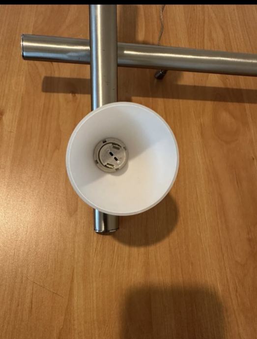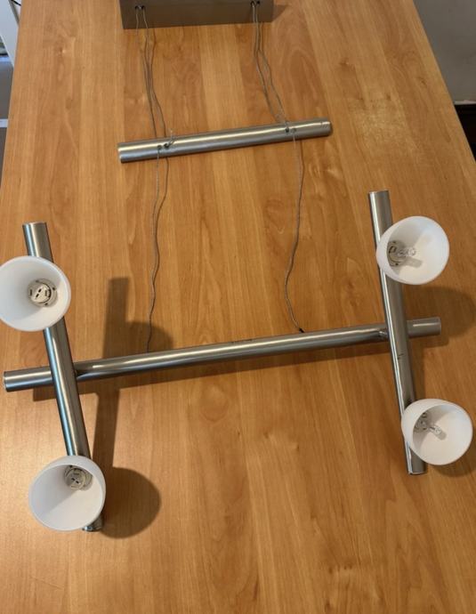 Prodajem rasvjetno tijelo s četiri svijetla u modernom dizajnu. Konstrukcija je od nehrđajućeg čelika s mat završnom obradom, a sjenila su bijela konusnog oblika. Tijelo se sastoji od glavne horizontalne šipke i dvije vertikalne grane, sa po dva izvora svjetla na svakoj strani. Pogodno za montažu kao visilica, kabeli za napajanje su prisutni. Funkcionalno i u dobrom stanju. 098728282