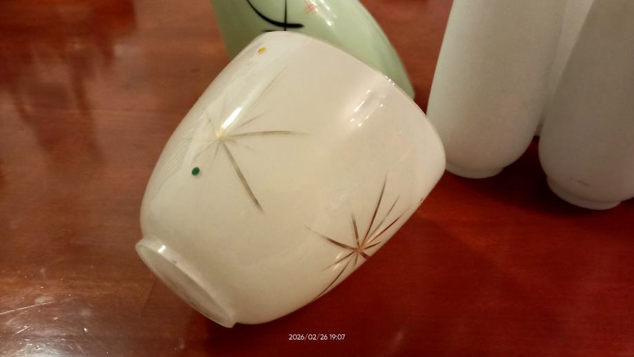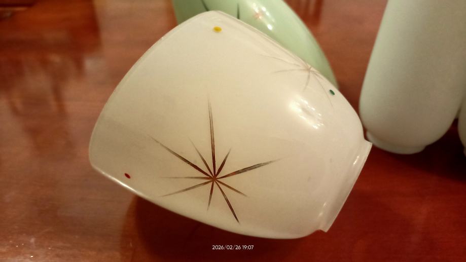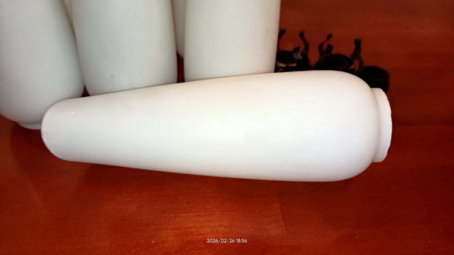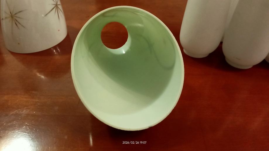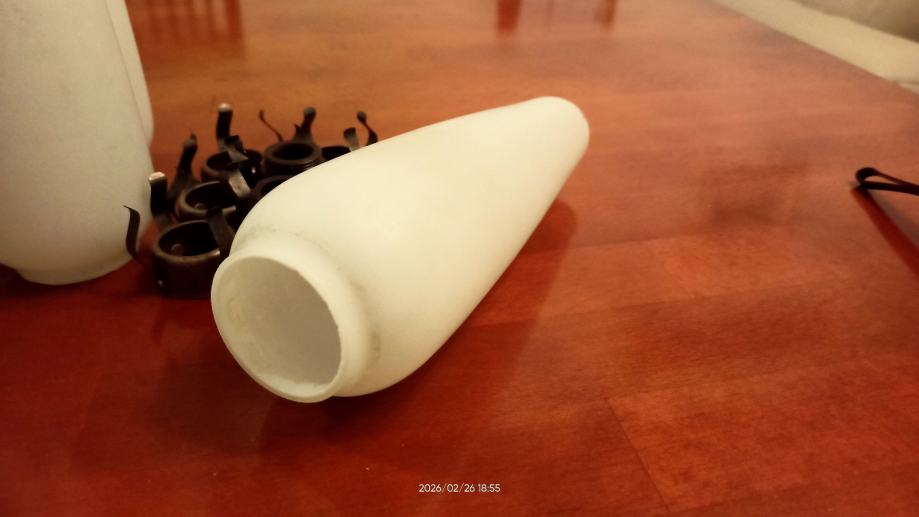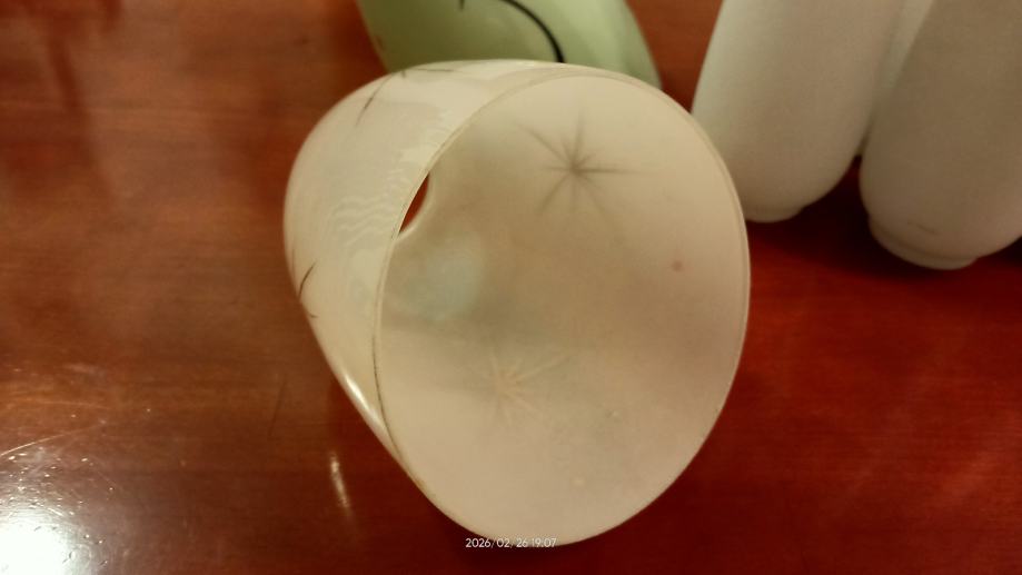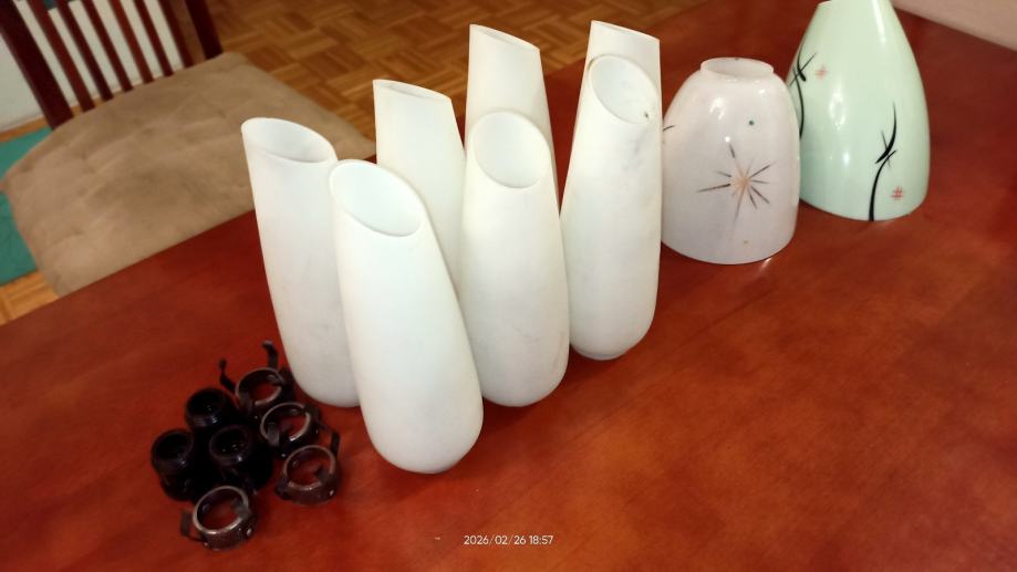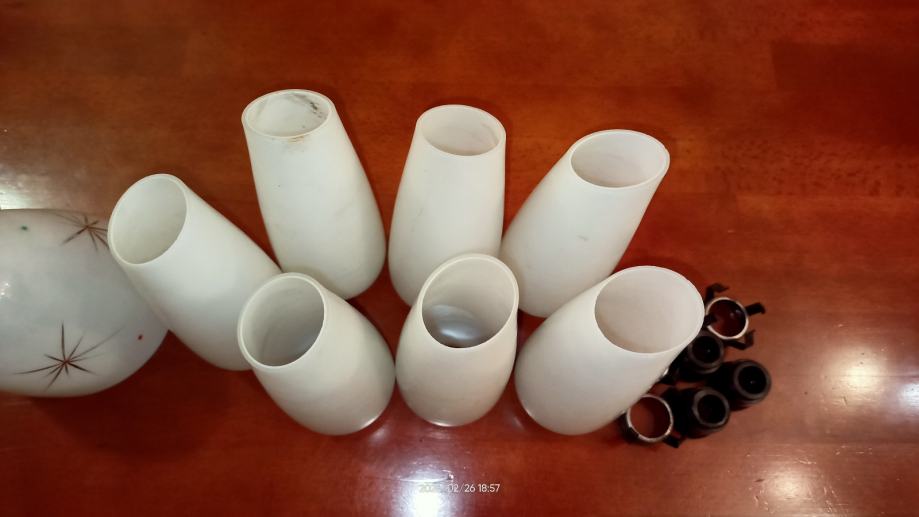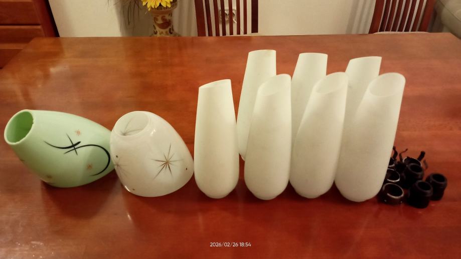 Prodajem staklena sjenila za lustere, sva neoštećena. 7 kom. bijela tulipan sjenila izduženog oblika, duž. 19 cm, promjer prihvata 4 cm, zatim dva okrugla sjenila s ručno oslikanim ukrasima, jedno u nježnoj zelenoj boji s crnim i crvenim motivima duž. 17 cm, promjer prihvata 4,5 cm, a drugo bijelo s motivom zvijezde u smeđim tonovima duž. 12 cm, promjer prihvata 4,5 cm. Uz sjenila dolaze i metalno-plastična grla za montažu.Radi se o starijim, kvalitetno izrađenim staklenim sjenilima koja odgovaraju lusterima s više krakova. Cijena za komplet 60€. Za pojedinačno dogovor. Molim zvati na mob. 091/2356157