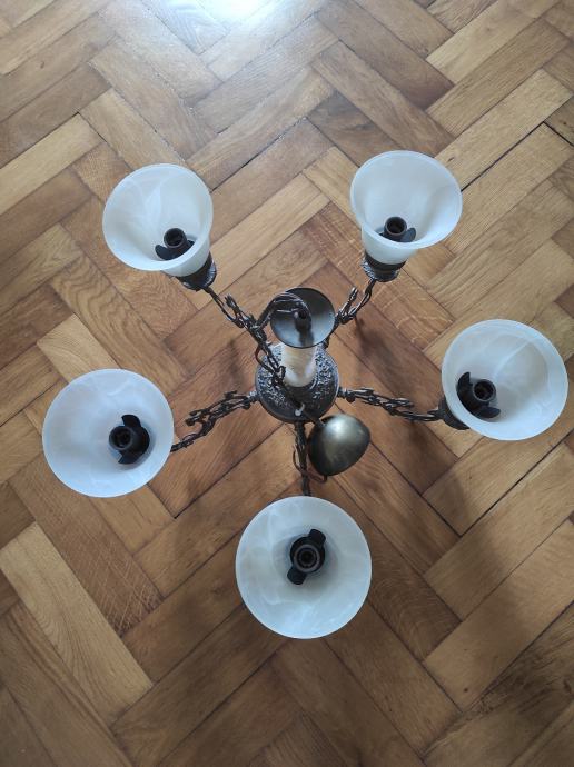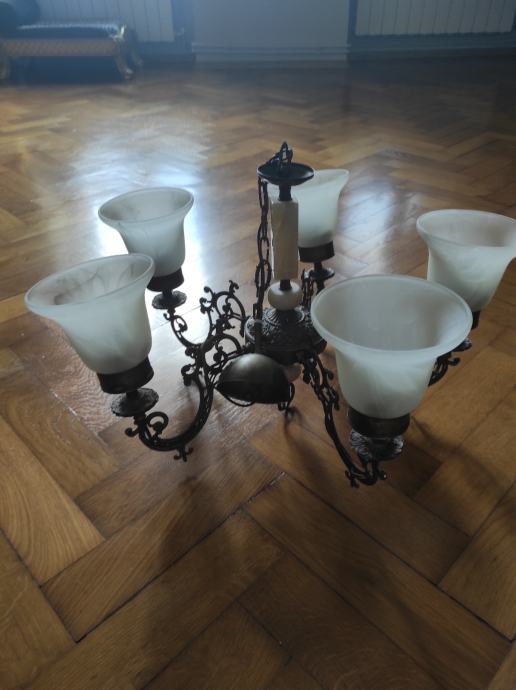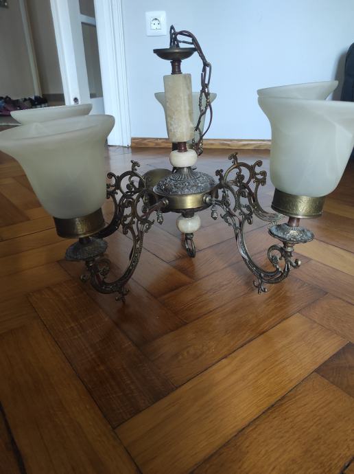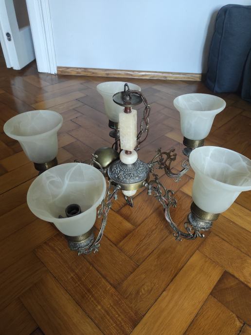Luster je od mesinga sa ukrasom od oniksa.Ima pet krakova koji se mogu okrenuti i na dole.Luster je u odličnom stanju.