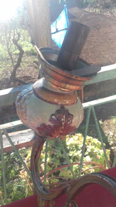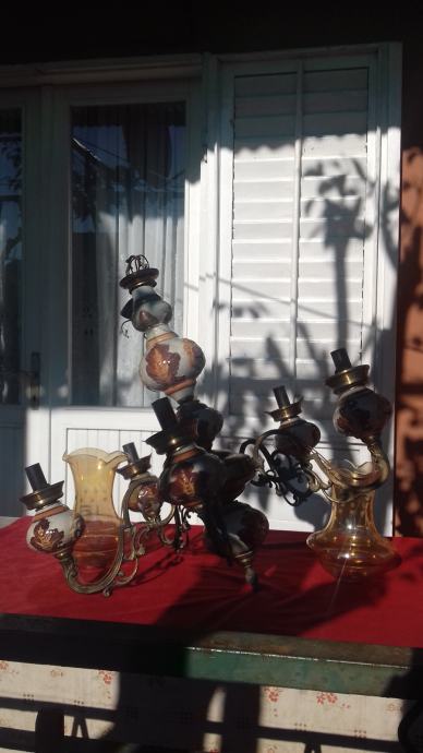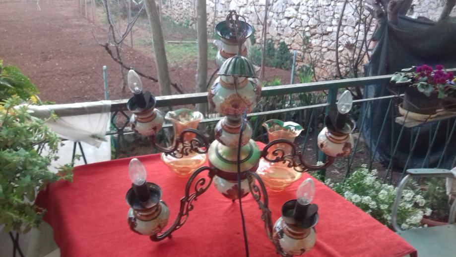 Luster ima pet rasvjetnih tijela i dvije staklene žalunjere. Najvećim dijelom je izrađen od mesinga, osim sredine tijela lustera koji u unutrašnjosti moguće ima željezne dijelove ili je neki od vanjskih dijelova željezan ( privlači se na magnet kao željezo ). Luster je u funkcionalnom stanju; prikazano na fotografiji. Cijena lustera je 106 eura. Mogućnost osobnog preuzimanja u Zadru. Kontakt broj mobitela: 091 131 10 36.