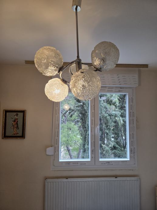 Prodajem očuvan vintage luster iz 1970-ih godina. Luster se sastoji od kromirane konstrukcije i 5 sjenila od debelog, reljefnog stakla s predivnim uzorkom koji stvara ugodnu atmosferu i toplo ambijentalno svjetlo.