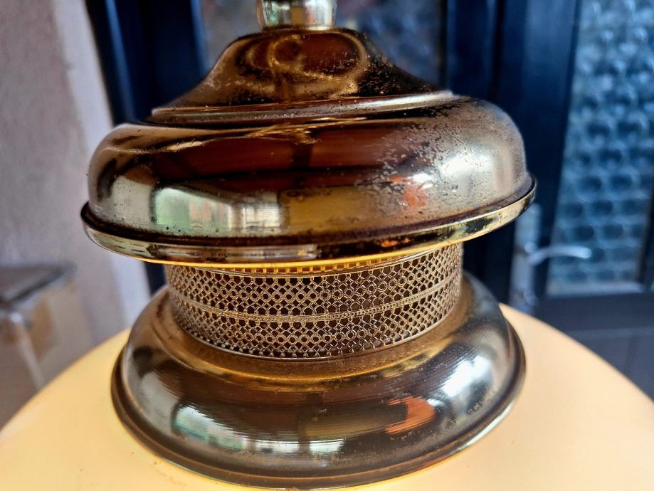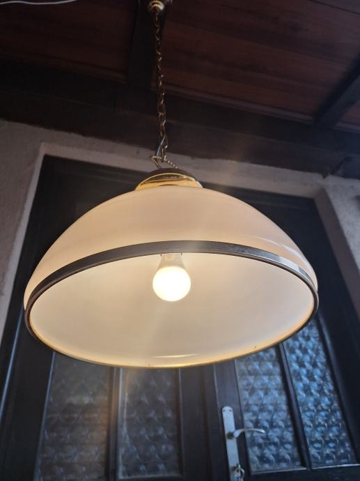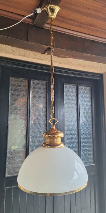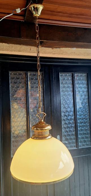 Originalna mesingana konstrukcija s opalnim (mliječnim) staklenim sjenilom. Vrlo lijep ambijentalni topli svjetlosni efekt – idealan za kuhinju, blagovaonicu, kafić ili rustikalni/industrijski interijer.