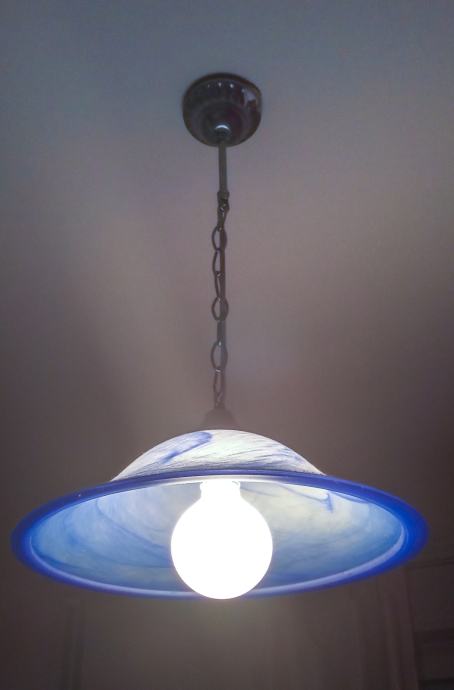 Prodajem stakleni viseći luster plave boje sa žaruljom. Moderan dizajn.