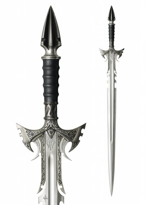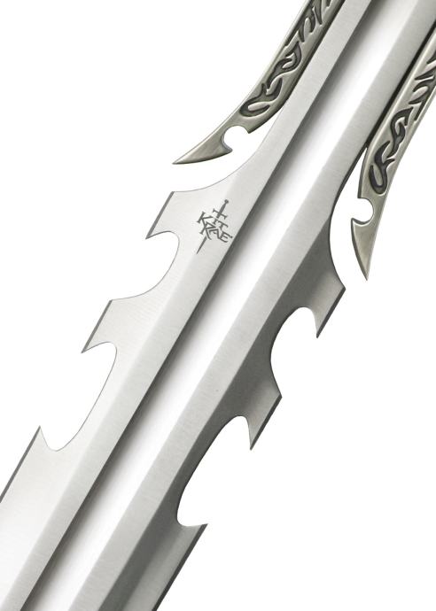 Drška je opremljena raskošno ukrašenim čvrstim metalnim štitnikom za ruku, čvrsto omotanom ručkom od prave kože i izbočenim oklopom. Oštrica od nehrđajućeg čelika AUS-6 ima duboki i laserski ugraviran amblem Kit Rae