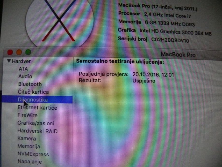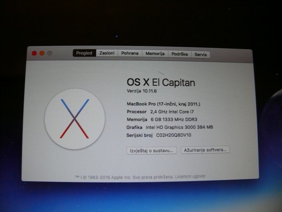 Prodajem hitno laptop Apple MacBook Pro 17" sa Intelovim četverojezgrenim i7-2760QM procesorom, 6gb rama, dva grafička procesora: Radeon HD 6770M sa 1 gb GDDR5 memorije i intergriranom HD3000. Grafičke se prebacuju automatski zavisno o opterečenju. Jak procesor i brza grafička omogućuju rad sa svim profesionalnim programima brzim tempom. Laptop je malo korišten isključivo sa daljinskom tipkovinicom i mišem tako da nema znakova korištenja. Nema ogrebotina niti tragova korištenja... Čip grafike i baterija je promjenjena u Apple servisu u njemačkoj prije godinu i pol. Baterija izdržava oko 5 sati surfanja. Kupljen je sredinom 2012. Moguća proba i slanje poštom po potrebi. Zamjene isključene.