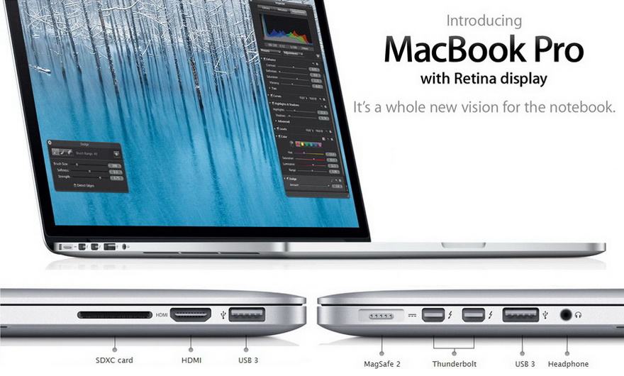 802.11ac Wi-Fi, Bluetooth 4.0, 2 x USB 3.0, 2 x "Thunderbolt 2", HDMI, an audio in/out port, and an SDXC card