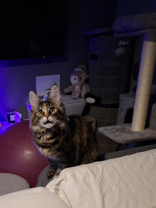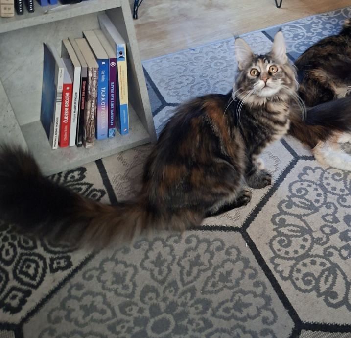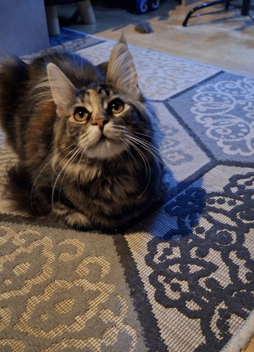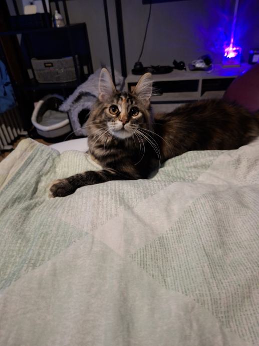 Pametna. Kao mali pesek donosi miševe da bacite. Spretna, draga. Predilica, umiljata, zaigrana i izvornog šumskog izgleda vrste Maine Coon.