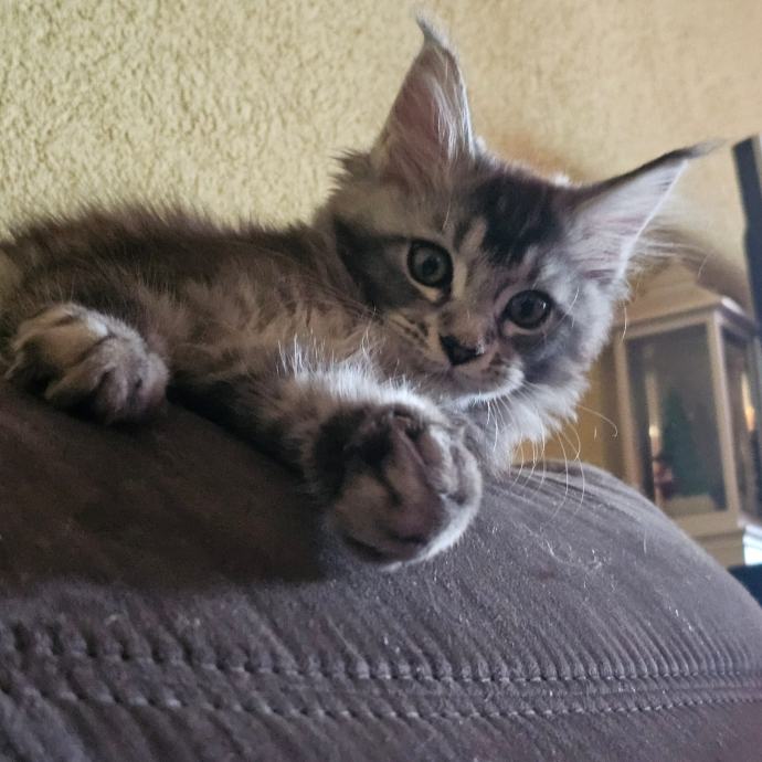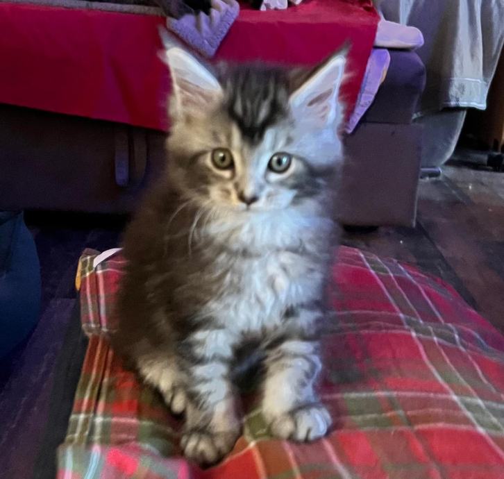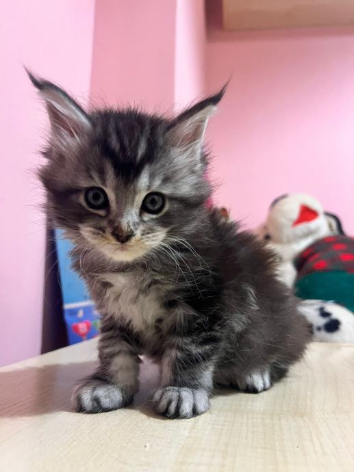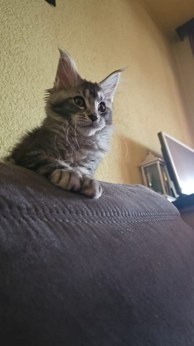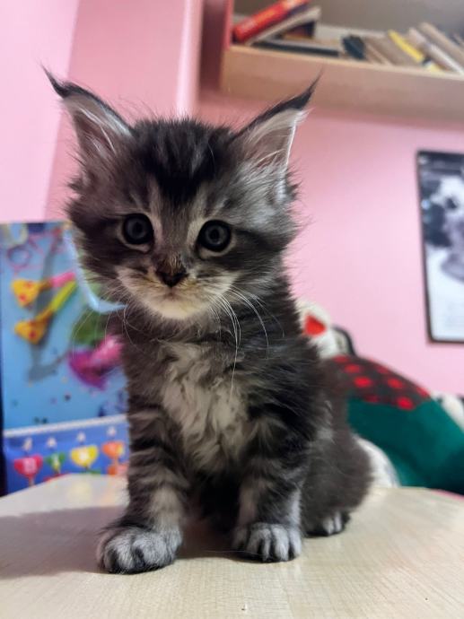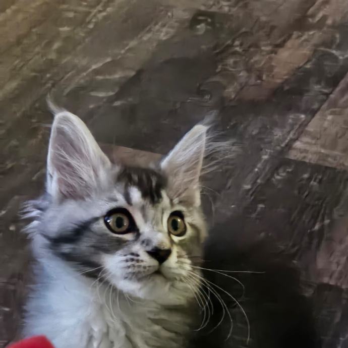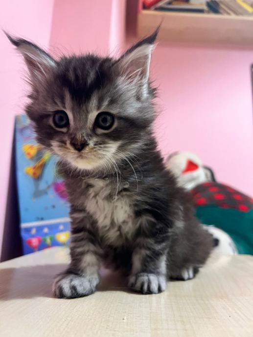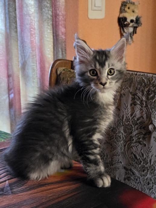Prodajem mačića pasmine Maine Coon. Radi se o black-silver (smoke) mačiću -ženka 3 mj.s karakterističnim ušnim čupercima i gustom, mekom dlakom tipičnom za ovu pasminu. Maine Coon je jedna od najvećih pasmina mačaka, poznata po prijateljskom karakteru i inteligenciji.