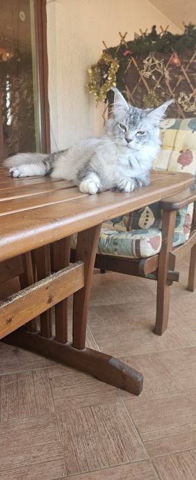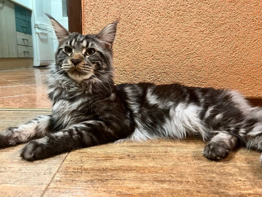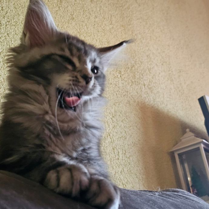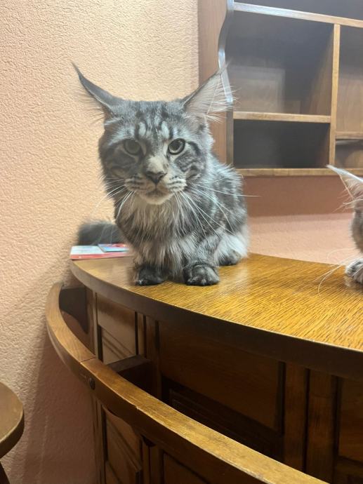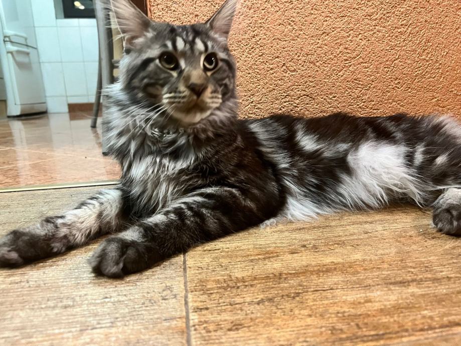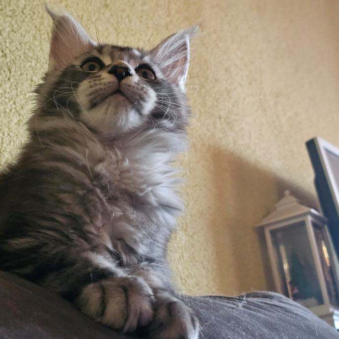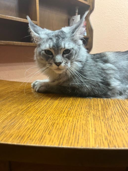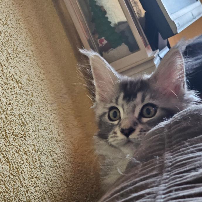 Prodajem mačića pasmine Maine Coon. Radi se o black-silver (smoke) mačiću -ženka 3 mj.s karakterističnim ušnim čupercima i gustom, mekom dlakom tipičnom za ovu pasminu. Maine Coon je jedna od najvećih pasmina mačaka, poznata po prijateljskom karakteru i inteligenciji.