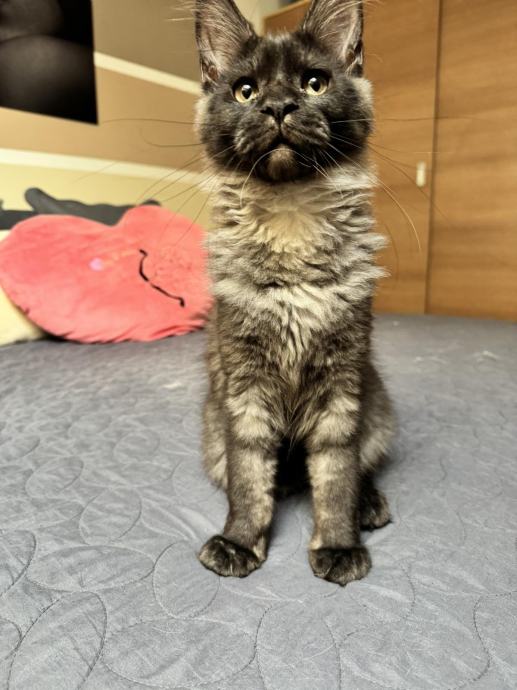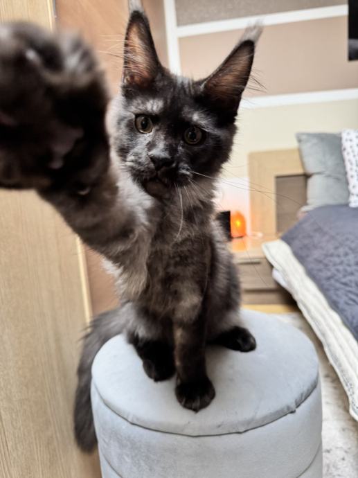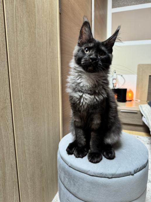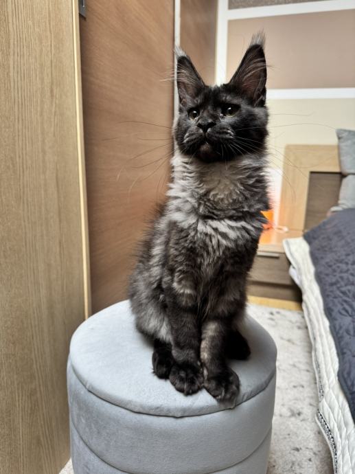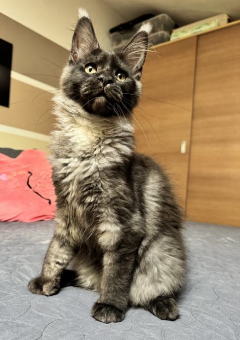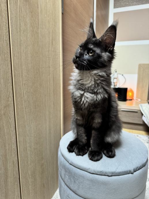 Na prodaju je umiljata i razigrana Maine Coon mačkica stara 4 mjeseca, u prekrasnoj black smoke boji. Prava mala dama – voli društvo, maženje i igru, ali zna biti i mirna kad dođe vrijeme za odmor.